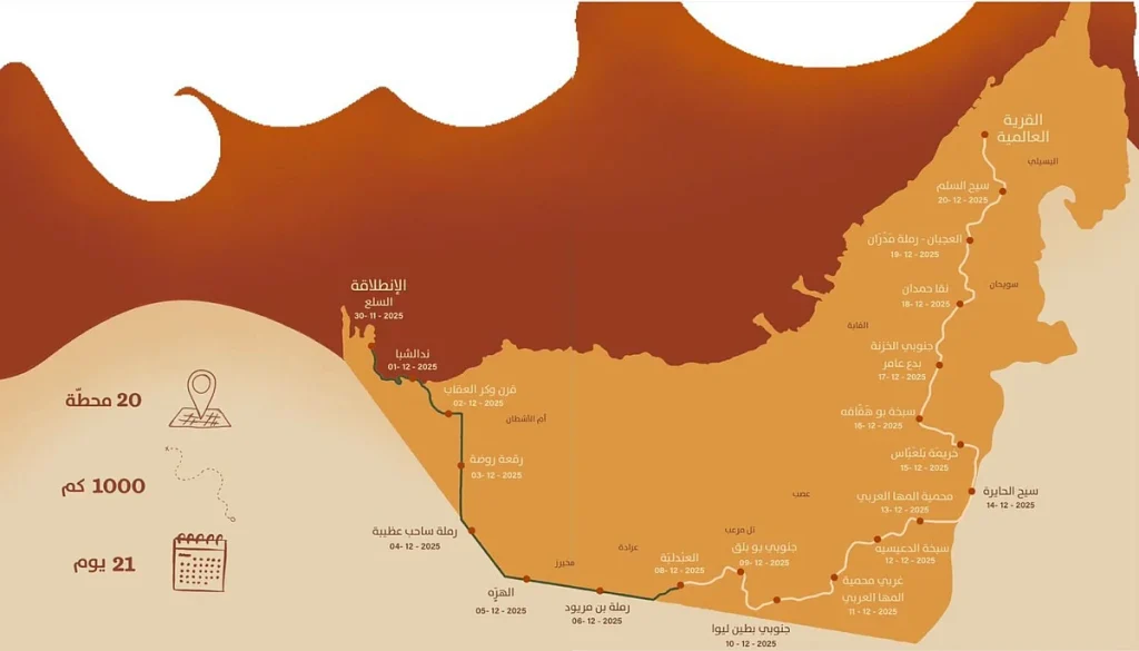 Yolculuklarına 30 Kasım Pazar günü şafak vakti, Abu Dabi’nin 350 km batısında ve Dubai’ye 450 km uzaklıkta bulunan Al Dhafra bölgesindeki As-Sila’dan başlayacaklar. Karavan hazırlanmış bir rota izleyecek ve deve yürüyüşçüleri, 2014’ten beri yıllık çöl yolculuğunu organize eden Hamdan Bin Muhammed Miras Merkezi (HHC) tarafından hazırlanan kamp istasyonlarında dinlenecek.
