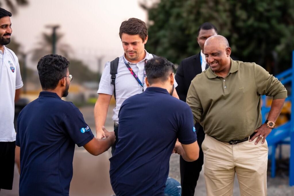 Sri Lanka kriket efsanesi Aravinda de Silva, DP Dünya Kriket Sahası’nda hayranlarıyla el sıkışıyor. – Shihab’ın fotoğrafları