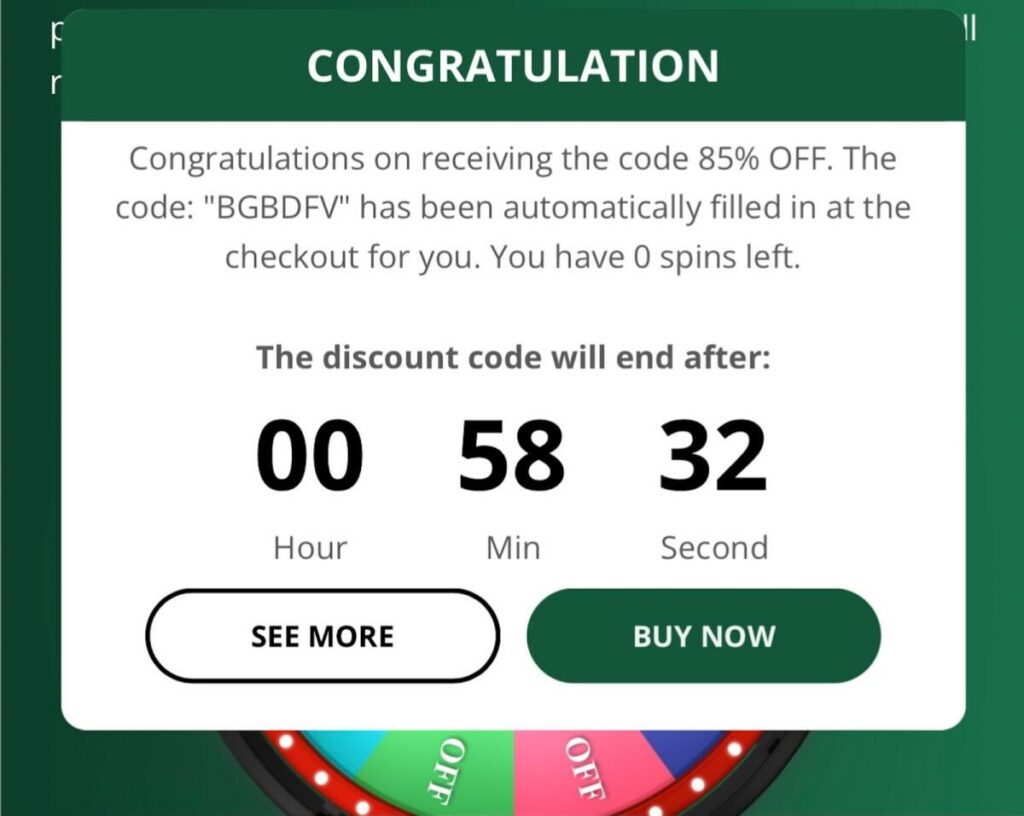 Bağlantıya tıklamak, alıcıları Rolex’in BAE’deki 57. yıldönümünü kutlayan “Lucky Spin” oyununu içeren ikna edici bir web sitesine götürür. Alışveriş yapanlar, büyük bir indirim şansı için tekerleği döndürmeye ikna edilir. Bunu yaptıklarında, ödeme sırasında otomatik olarak uygulanan% 85 indirim kodu “BGBDFV” aldıkları için bir mesaj onları tebrik eder.