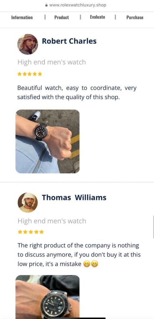 Web sitesi, çevrimiçi alışveriş yapanlara, geleneksel kıyafetli Arap erkekler olarak resmedilmesine rağmen garip bir şekilde Batılı isimleri olan “Robert Charles” ve “Thomas William” gibi ‘mutlu müşterilerden’ gelen parlak incelemelerle güvence veriyor.“Thomas William” dan böyle bir inceleme, “Şirketin doğru ürünü artık tartışılacak bir şey değil; Bu düşük fiyata satın almazsanız, bu bir hatadır.” Bu incelemeler, dolandırıcılığa bir meşruiyet katmanı eklemek ve kurbanları tuzağa düşürmek için hazırlandı.