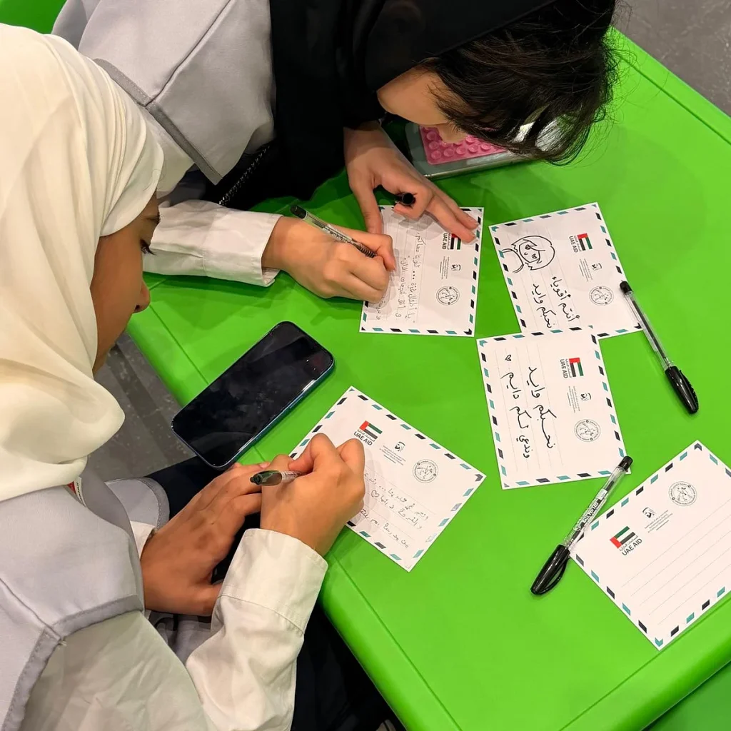 Salonun bir köşesinde öğrenciler yardıma eşlik edecek mesajlar yazdılar. Arka Sultan ve Bizna Yusuf, ‘Gazzeli çocuklar, kalbimiz sizinle. Siz Arap yiğitlerisiniz.