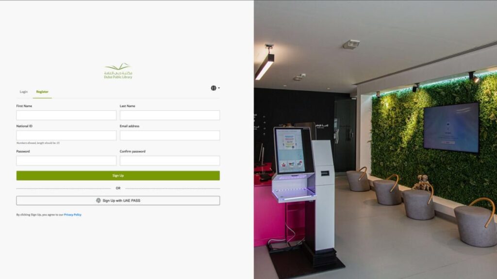 Başvuru süreci basittir ve geçerli kimliğinizin yalnızca bir kopyasını gerektirir. Çevrimiçi olarak nasıl başvurabileceğiniz aşağıda açıklanmıştır:1. Önce Dubai Kültür ve Sanat Kurumu’nun web sitesine gidin. Gezilecek Yerlere gidin ve ‘Kütüphaneler’i seçin.2. Sayfanın en altına gidin ve ‘E-Hizmetler’e tıklayın.3. Yeni bir sayfaya yönlendirileceksiniz. Sol tarafta ‘Halk Kütüphaneleri Hizmetleri’ seçeneğini görebilecek ve seçebileceksiniz. Tıkladığınızda, sayfada ‘Yeni Üyelik’ göründüğünü göreceksiniz. Başlığın altındaki ‘Hizmeti Başlat’ı tıklayın.4. Bir kayıt sayfası (aşağıda resmedilmiştir) görünecektir. Burada bilgilerinizi doldurun ve kaydolun veya oturum açmak için BAE Pass’ı kullanabilirsiniz.