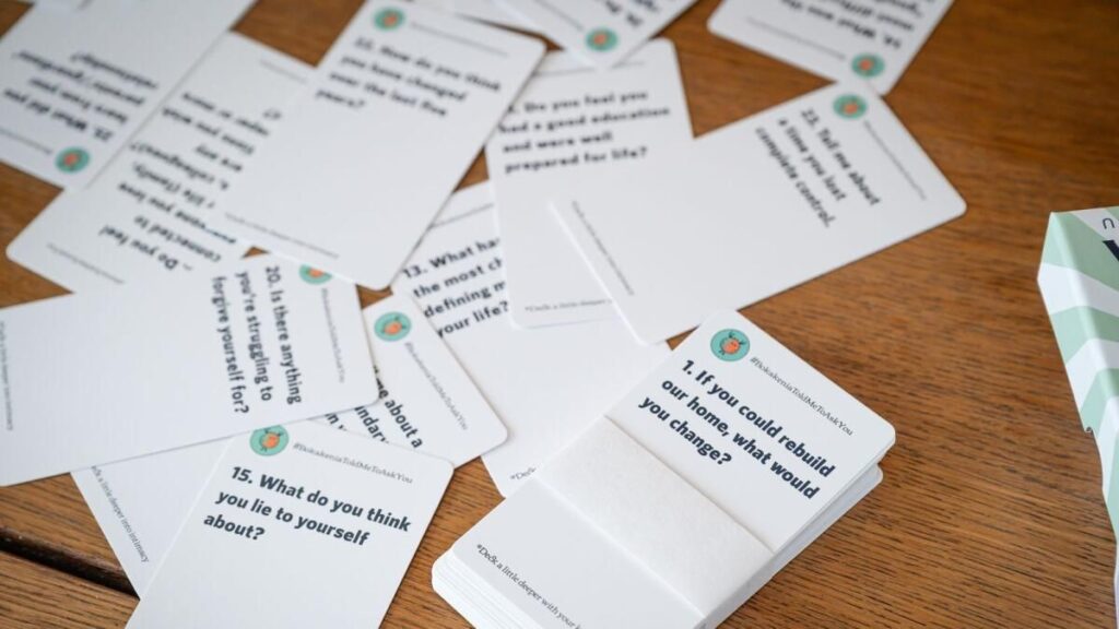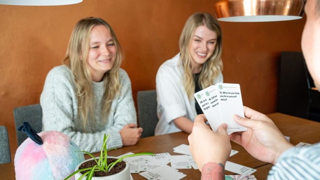 Christopher GammelgaardChristopher oyundaki erkek bakış açısına katkıda bulundu. “Benim gibi, mutlaka derin sorular sormayacak biri için, soruları kart oyunu kılığında sorabildiğimde biriyle bu konuşmaları yapmak çok daha kolay” diyor.Herkes için bir güverteÜçlü, farklı gruplar için ayrı desteler hazırladı. Herkesle oynayabileceğiniz kartlar (arkadaşlar, aile ve diğer sevdikleriniz), romantik çiftler için kartlar (yeni ve köklü), eşler için kartlar, ebeveynler ve çocuklar için kartlar ve iş arkadaşları için kartlar vardır. Her güverte, anlamlı konuşmalar yoluyla bu sosyal dinamik içinde daha yakın bağlar kurmak için özel olarak tasarlanmış kapsamlı bir şekilde test edilmiş 31 soru içerir. Christopher’ın da eklediği gibi, “Kartlar, bazıları ‘derin buzu kırmanıza’ yardımcı olabilecek ve takip sorularını çok daha rahat bir şekilde başlatmanıza olanak tanıyan birkaç farklı konuyu kapsayan sorular içeriyor. Bazen, konuşmalardan günler sonra.”