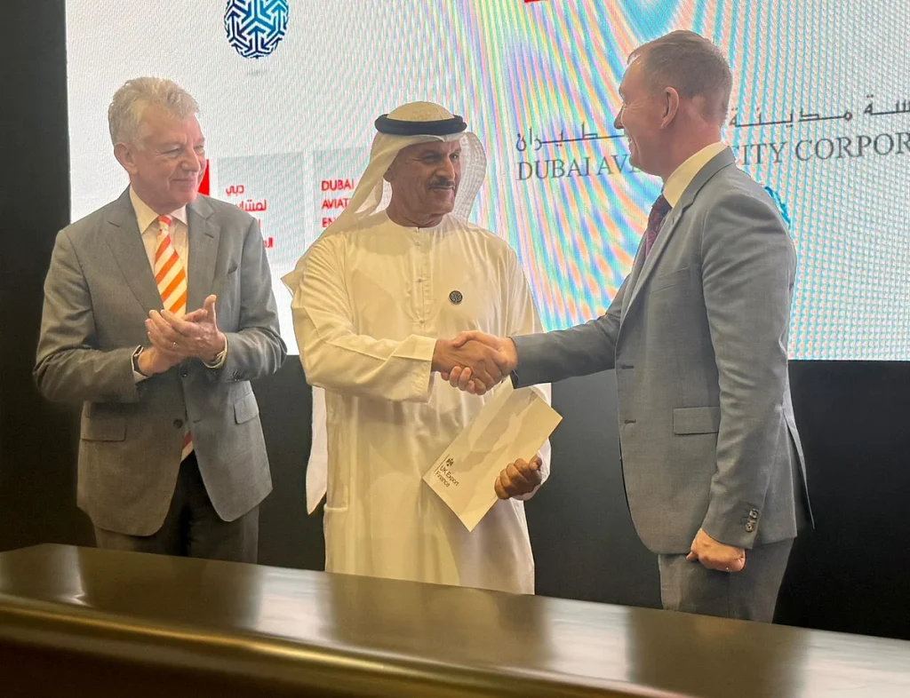 İNGİLTERE Ticaret Bakanı Sir Chris Bryant, Dubai Havacılık Şehri Şirketi ve Dubai Havacılık Mühendisliği Projeleri icra kurulu Başkanı Halife Al Zaffin’e ve Dubai Havalimanları CEO’su Paul Griffiths’e Salı günü devam eden Dubai Hava Gösterisinin ikinci gününde mektubu sundu.