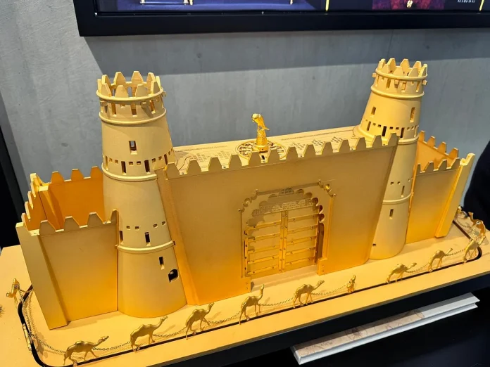 Dubai Saat Haftası’nda sergilenen karmaşık saatlerden biri, saati gösterecek bir rüzgar kulesi, bir şahin, deve ve bir Bedevinin bulunduğu bir kaledir. Elleri ve kadranı olmayan saatin rengi altındır ve Al Ain’in çöllerinden esinlenmiştir. Saatin hemen yanında oturan gururlu yapımcısı Miki Eleta.