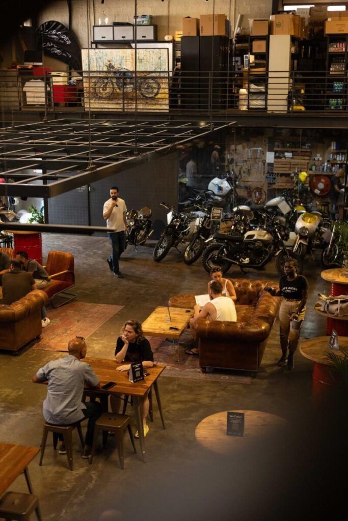 Al Quoz’un sanayi bölgelerinin bir tür soylulaştırma yaşadığı ilk günlerde, Café Rider’ın kurucuları hayallerini inşa etmek için bir köşe buldular. Üç sütuna hizmet etmek bir rüyaydı … kahve, topluluk ve motosikletler. Yıllar geçtikçe, yaşamın birçok kesiminden, farklı milletlerden insanların gelip gittiğini gören oldukça büyük bir lokanta haline geldi.Saksı bitkileri ve oldukça göze çarpmayan bir tabela ile süslenmiş bej duvarın arkasında, çevresiyle uyumlu endüstriyel estetiğe sahip, geniş aralıklı bir kafe var.Geniş aralıklı oturma düzeni (ahşap üst masalar ve çelik sandalyeler ve tabureler) ve çift yükseklikte tavan sayesinde içi temiz ve havadar hissediyordu. Mekanik bir sanat eseri olan 20’li dev ayak fanı da onu hoş ve havadar tutuyor. Ayrıca üst katta ek oturma yerleri ve aralarından seçim yapabileceğiniz çeşitli kitaplar vardır. Sergilenen bisikletler sayesinde motosikletin harika titreşimleri çoğalıyor. Ziyaretim sırasında, girişte park edilmiş bir Norton vardı ve birkaç kişi, cam duvarların arkasında kasıtlı olarak halka açıklanmış olan yapım / onarım alanlarına destek verdi. Ayrıca, tişörtler, bardaklar vb. Dahil olmak üzere sergilenen kendi ürünlerinin iyi bir karışımına sahiptirler. bu davaya yardımcı olur.Bir kahve koklamayı seviyorsanız burayı çok seveceksiniz. Kahveyi kendi bünyesinde öğütüp kavuruyorlar. Taze tuttukları için onlara şükürler olsun! Hatta kokuların duyularınızla oynadığı, sadece fileli bir kapakla izin verilen kavurmalarının içine hızlıca bir göz attık. Merak ediyorsanız, 1 kg ‘The Rider’ lezzeti için Dh29’dan başlayan fiyatlarla toptan ve perakende satış gereksinimlerini karşılarlar.