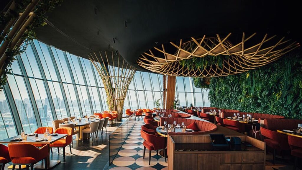 Hem gündüz hem de gece saatlerinde avucunuzun içindeki bu çok uzun restoranda asansörün sürekli uzun kuyrukları, ne kadar talep edildiğini gösteriyor. Birincil çekiliş, tüm önemli simge yapıları gösteren çarpıcı 360 derecelik görünümdür. İçeride, bol bitkiler ve canlı bir DJ performansı ile atmosfer modaya uygun. Menü, ıstakoz, mango ve yer mantarı içeren lüks bir suşi rulosu olan Dubai Samba rulosu gibi Peru ve Japon yemeklerinin bir karışımını sunmaktadır.