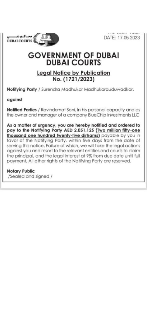 [Editörün Notu: Bluechip Computer Systems LLC ve Bluechip Emlak Komisyoncuları, makalede bahsedilen BlueChip Grubuyla ilişkili değildir.]Bluechip’in sahibi Ravinder Nath Soni’ye, Dubai Asliye Mahkemesi tarafından yedi gün içinde bir çek icra başvurusuna veya mahkeme hazinesine 10,05 milyon Dh ödemesi emredildi. Mahkeme, buna uyulmamasının kendisine karşı yasal işlem başlatacağı konusunda uyardı.Nerede olduğu bilinmeyen Soni, milyonlarca yatırımcının fonuyla ortadan kaybolduğu iddia edildikten sonra kapsamlı bir soruşturmanın merkezinde yer alıyor. Şirketin profesyoneli Sandeep Raj, “Ondan haftalardır haber alamadık” dedi.27 Mayıs Pazartesi günü yayınlanan mahkeme kararı, Dubai Mahkemelerinin 17 Mayıs 2023’te yerel bir gazetede Soni’ye başka bir yatırımcı olan Surendra Madhukar’a 2,05 milyon Dh’yi ödemesini emreden bir bildiri yayınladığı geçen yıla benzer bir örneği takip ediyor.