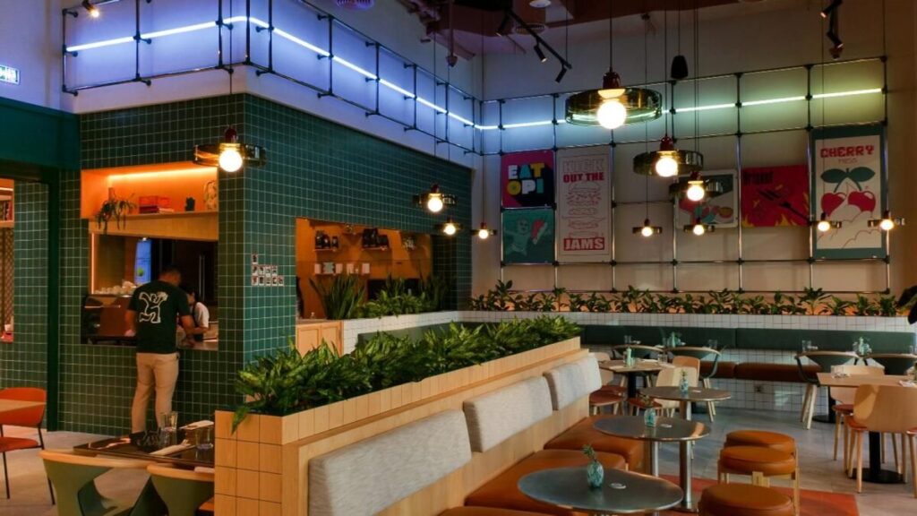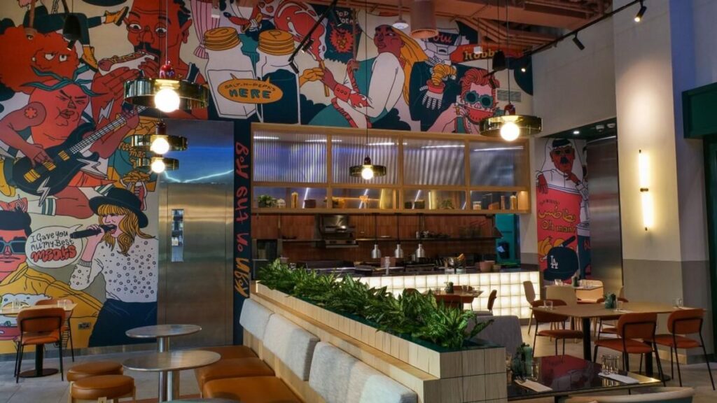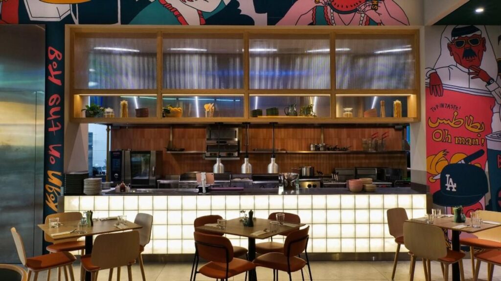 Şirketin çözmesi gereken bir sonraki şey konumdu; Diğer şubeler planlanmış olmasına rağmen Eatopi şu anda Bir Merkezde bulunuyor. Ve son olarak, dekora karar verme zamanı gelmişti.Ataya, ”Eatopi’nin siyah beyaz, çok geometrik, biraz ciddi ve çok temiz olacağını düşündük” diyor ve hemen işe yaramayacağını itiraf etti. “Biraz daha aşınmış bir hip-hop, R & B müzik türü markaya dönüştü, çünkü müzik metaforu insanlarla en çok rezonansa giren şeydi.”Yerel kalmasını sağlayan grup, BAE merkezli sanatçı Rami Afifi’yi ünlü albüm kapaklarının versiyonlarını duvara boyaması için işe aldı; kısmen grafiti, kısmen pop-art, atmosfer Amerikan lokanta-fast-food merkezidir. “Bu, Eatopi’de bulunan ilk yemeklerde bir tür oyun. Cheesecake bizde ama Nirvana kapağı gibi yaptı. Yüksek Derzimiz var, Çirkin Eriştelerimiz var “diyor Ataya, duvardaki demirbaşlara işaret ediyor.”Bu ‘müzik’ metaforuna gerçekten eğildik,“ diyor Ataya, ” Konumumuz ve hatta bir pop-up’ımız olan her yerde müziğin öyle olması gerektiğinden emin olduk. Birlikte çalıştığımız tüm şefler, müzik zevklerini anlamak istiyoruz ve bunu mağazada temsil ediyoruz.”