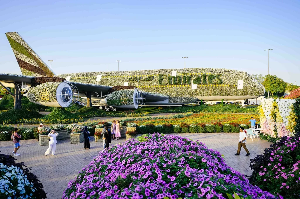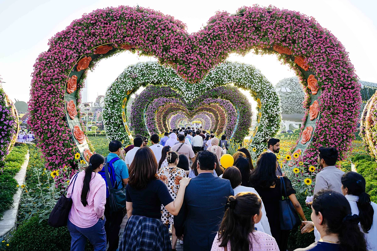 Rutubete rağmen, sakinler ve turistler ikonik kalp şeklindeki girişte, tümü pembe, sarı, beyaz ve mor renklerde büyüleyici çiçeklerle süslenmiş bir Emirates uçağının devasa kopyasına kadar yürüdüler.
