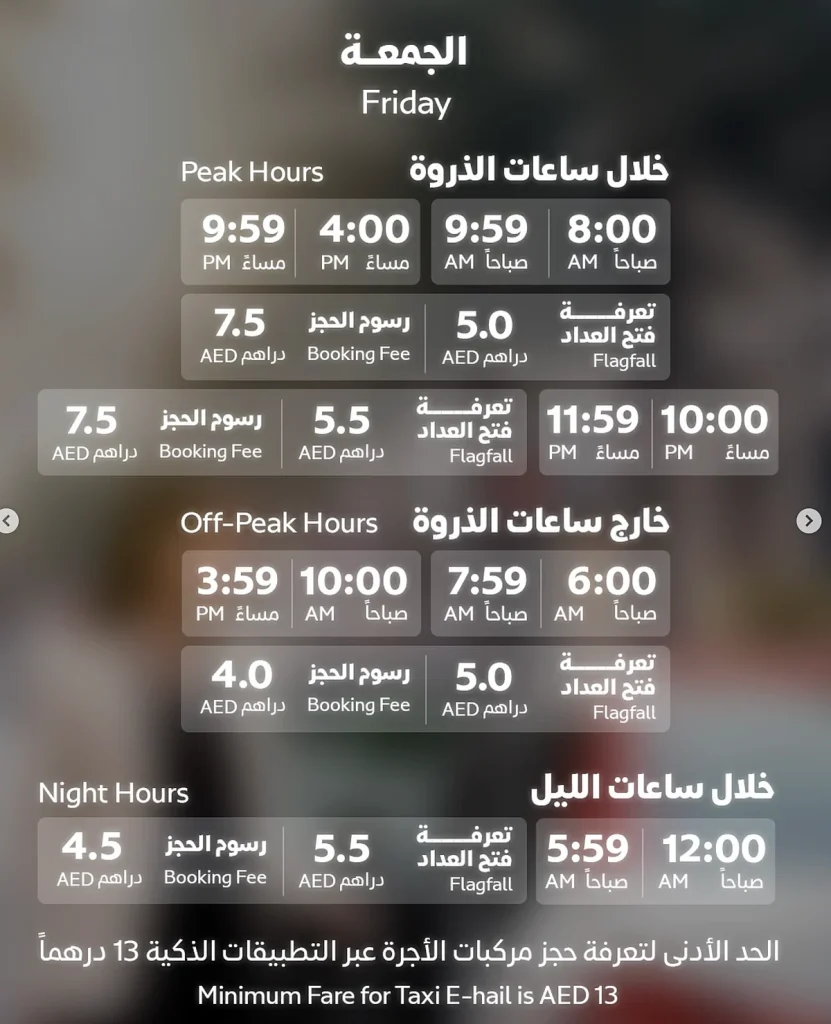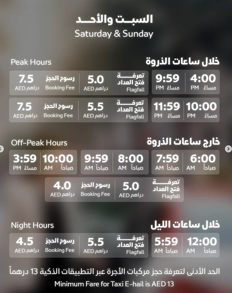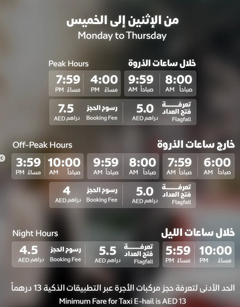 Yeni ücret yapısı kapsamında asgari taksi ücreti Dh12’den Dh13’e yükseltildi. Kurum ayrıca haftanın gününe bağlı olarak değişen yeni yoğun saat oranları ve rezervasyon ücretleri de getirdi.