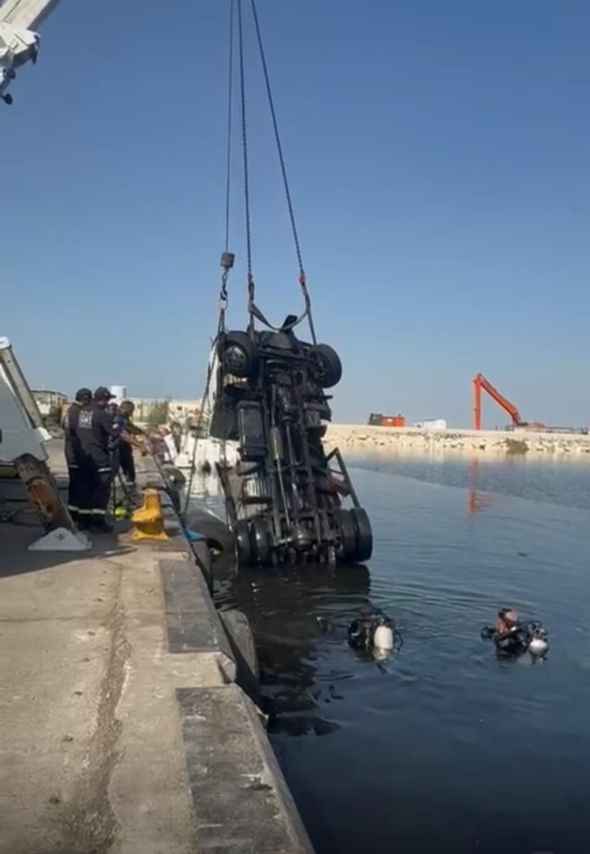 Dubai Limanlar Polis Karakolu’ndaki Deniz Kurtarma Departmanından dalgıçlar, Ulaştırma ve Kurtarma Genel Müdürlüğü ile işbirliği içinde, sürücünün park ederken uygun güvenlik önlemlerine uymaması nedeniyle Al Hamriya bölgesindeki iskeleden düşen bir kargo aracını kurtardılar. araç.