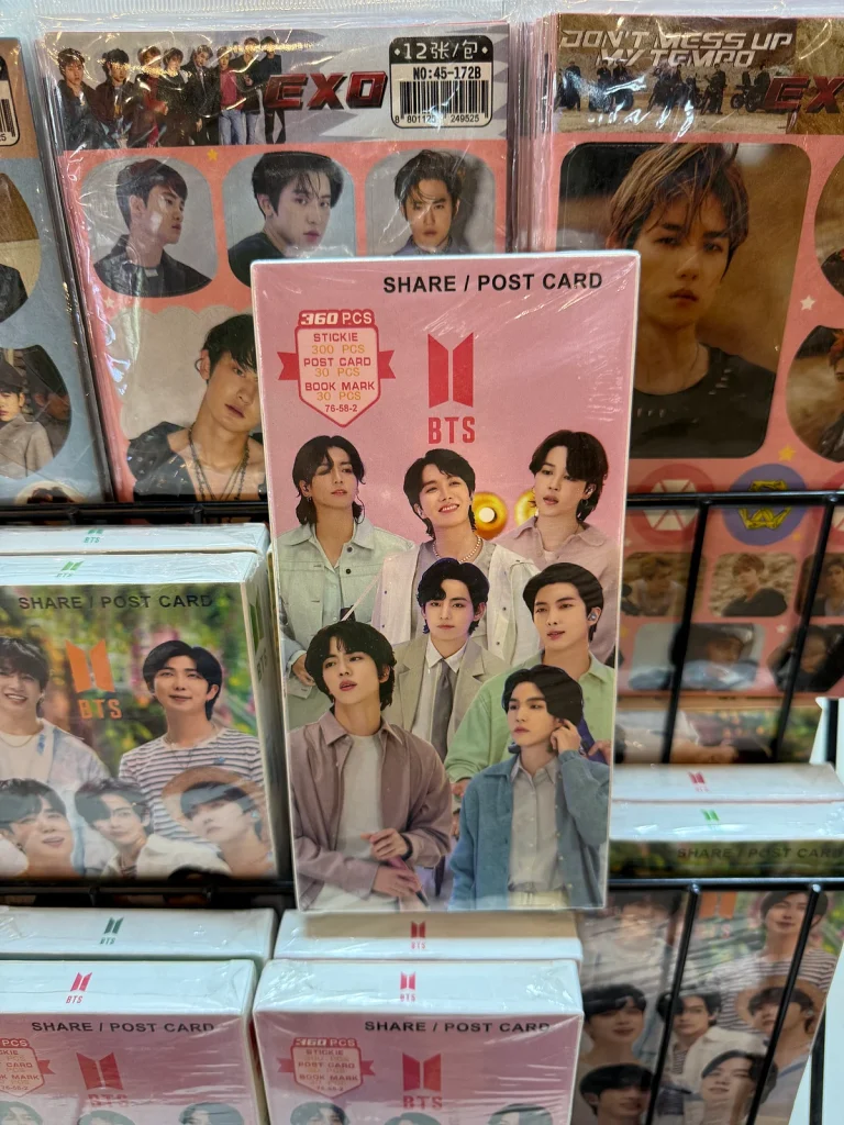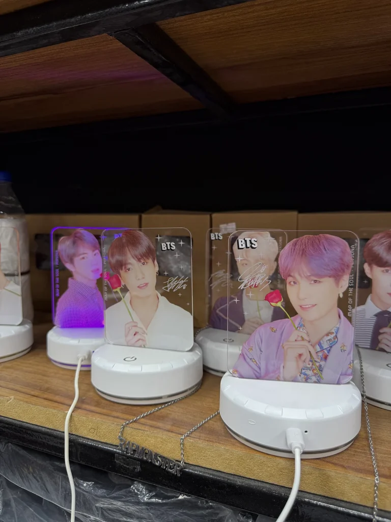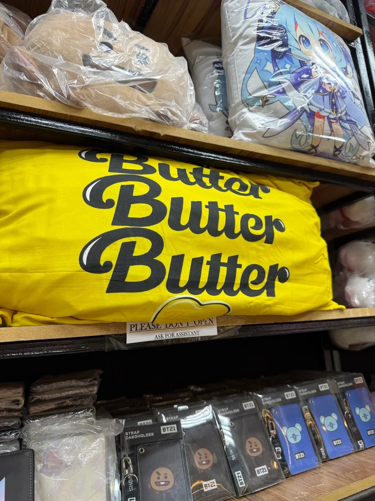 K-pop ve anime mağazasında hayranlar, en sevdikleri K-pop yıldızının fotoğrafıyla fotoğraf kartları, peluşlar ve diğer güzellikler satın alabilirler.BTS hayranları, yedi üyenin hepsinin yer aldığı lambalar, Tereyağlı yastıklar ve BT21 karakterli çok sayıda ürünle seçim için şımartılacak.