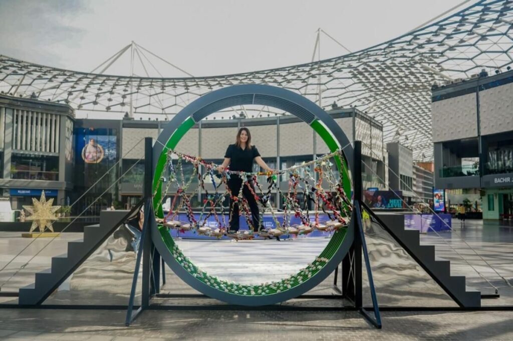 City Walk’ta sergilenen ‘Boşluğu Kapatmak Heykeli’ enstalasyonu, doğrusaldan döngüsel ekonomiye geçişi simgeliyor.Çöl tahtası, çelik gibi yerel kaynaklı malzemeler ve tekstil modası atıkları ve hurma çekirdeği bazlı çimento benzeri bir malzeme olan ‘tarih betonu’ gibi yeniden tasarlanmış tekstiller kullanan öğrenciler, İrlanda halat köprüsünü canlı yapı için ilham kaynağı olarak kullandılar.Benzer şekilde, başka bir sanat eseri olan ‘Slow Fashion Buzz Wire’, 3 boyutlu bir perspektif sanatını içeriyordu. Enstalasyon, belirli bir açıdan bakıldığında “moda” kelimesini ortaya çıkararak insanları metal çerçeve labirentine katılmaya ve gezinmeye davet ederek yavaş moda ilkelerini vurguluyor.Lycée Français International de l’aflec’teki 5. Sınıf öğrencisi Layal Chahin, “Atölyelere katılmak ve bu enstalasyonları inşa etmek bana geri dönüşüm ve geri dönüşüm yoluyla ne kadar yapılabileceğini gerçekten gösterdi, eski ve çirkin bir şeyin gerçekten güzel görünmesini sağladı. Projenin benim için en keyifli yanı köprünün rayını oluşturan örgüleri yapmaktı. Ördüğüm kumaş parçalarını tanıyabilmeyi severdim.”
