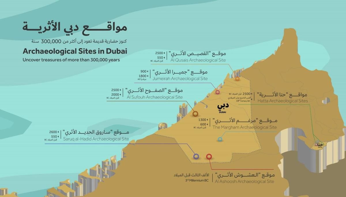 Dubai’de yıllar boyunca yapılan arkeolojik araştırmalar, diğerlerinin yanı sıra Saruq al-Hadid, Al Sufouh, Jumeirah, Al Ashoush gibi bir dizi arkeolojik alan ortaya çıkardı ve emirliğin şaşırtıcı bir şekilde 300.000 yıldan fazla bir geçmişe dayanan eski uygarlık köklerini ortaya çıkardı.Alt Paleolitik’ten (MÖ 1.500.000-300.000) Neolitik döneme (MÖ 8000-4000) ve geç islam dönemlerine (MS 19. yüzyıl) kadar Dubai, emirliğin tarihi sakinlerinin zengin ve kalıcı mirasını temsil eden 17’den fazla önemli arkeolojik alana sahiptir. ve Yakın çevredeki diğerleriyle etkileşimleri Doğuya.Bu siteler, emirliğin küresel miras haritası üzerindeki konumunu geliştirmek amacıyla Dubai Kültür ve Sanat Kurumu (Dubai Kültürü) tarafından yönetilmektedir.Emirliğe yayılmış bu arkeolojik alanlara bir bakış: