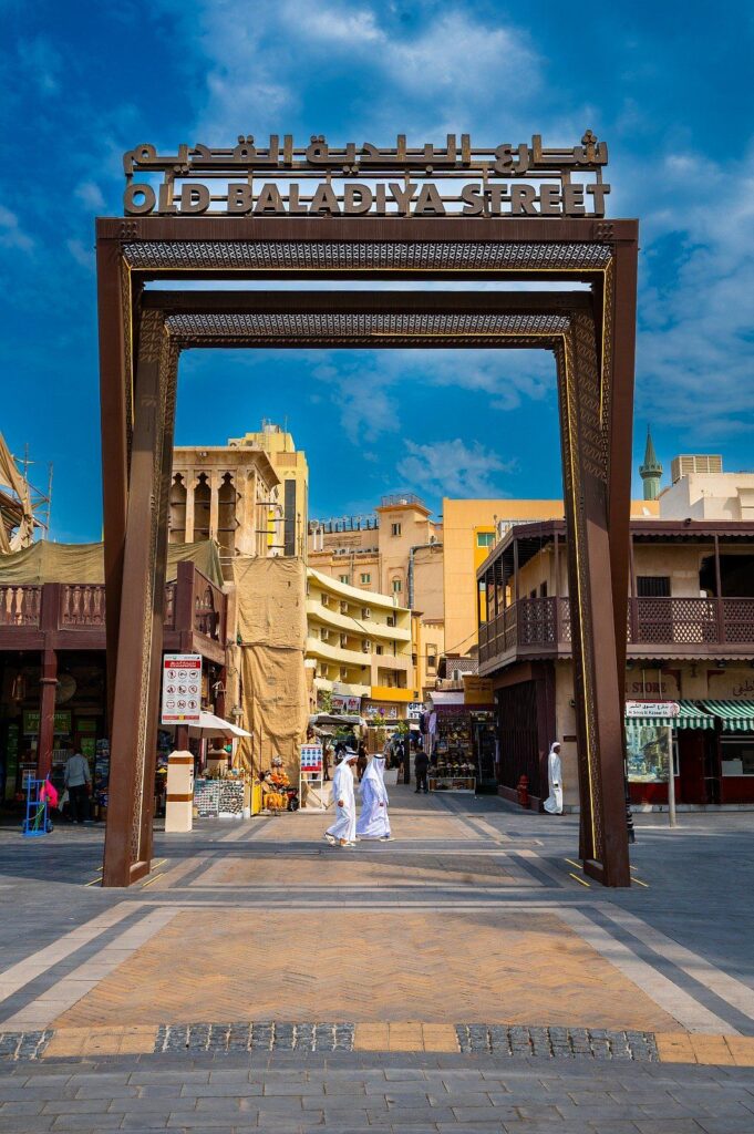 Grand Souq Deira’nın girişine yakın bakır renkli Eski Baladiya çerçevesindeki yürüyüş parkuruna başladık. Bu çerçeve, buradaki binalardan birinde bulunan Dubai Belediyesi’nin ilk ofisini onurlandırıyor. Yıllar geçtikçe, bölge birkaç yüz germe ve tadilattan geçti.