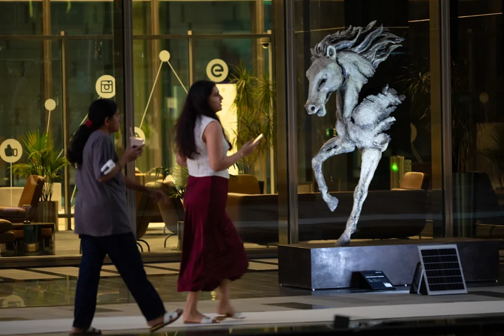 Anna Chekh’in gölge atları, tek bir uzun yapıya birleştirilmiş üç at başından yapılmış paslanmaz çelik bir heykeldir. Cilalı metal, dıfc’nin kulelerini, gökyüzünü ve yoldan geçenleri yansıtarak izleyicinin nerede durduğuna bağlı olarak değişen görseller yaratır. Yüksekliği ve bitişi onu fotoğrafçılık için popüler bir yer haline getiriyor.