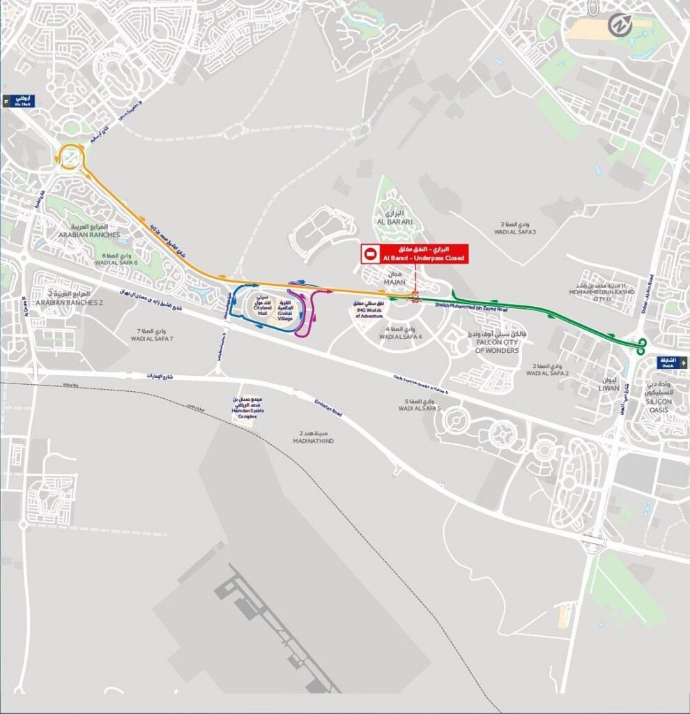 Sürücülerin gecikmeleri önlemek için Dubai–Al Ain Köprüsü (Jebel Ali’ye doğru U dönüşü) veya Global Village Alt Geçidi ve Umm Suqeim Caddesi kavşağı (Sharjah’a doğru U dönüşü) dahil olmak üzere alternatif rotalar kullanmaları önerilir. Sorunsuz bir işe gidip gelmek için önceden planlama yapılması şiddetle tavsiye edilir.