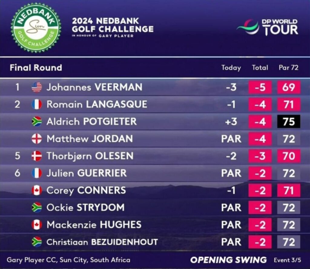 Son turda Veerman etkileyici bir 69 vuruşu yaptı ve zaferini tırnak ısırtan bir hesaplaşmada mühürledi ve turun en prestijli etkinliklerinden birinde adını kazıdı.Güne liderlikten beş vuruşla başladı, ancak son grupların hedef alması için eşitliğin altında beş kulüp binası hedefi belirlemek için test koşullarında altı kuş ve üç öcü taradı.Ve en son Güney Afrikalı Aldrich Potgieter’in playoffta Veerman’la yüzleşme şansını reddeden bir öcü ile doğrudan tellere gitti.Potgieter, üçüncü tur lideri onuncu turda bir kuşla üç atışlık gecelik avantajını geri kazandığında unutulmaz bir ev galibiyeti talep etmek için rotaya bakmıştı.Ancak Sun City’deki Gary Player Country Club’da nefes nefese bir öğleden sonra, 20 yaşındaki Veerman’a şok bir ipucu vermek için 12. sırada üçlü bir öcü teslim etti.Yine de, art arda ikinci güne gelince, 14’üncü Potgieter’e umut için sebep verdi ve parlak bir kuş onu tekrar öne koydu.Ancak Veerman, five under’da kulüp binasına gitmek için 18. sırayı güvenli bir şekilde ayırırken, Potgieter, 17’sinde iyi bir kuş şansını kaçırmadan önce 16. sırayı bu numaraya katılmak için kaçırdı.Bu, Potgieter ayın 18’inde kaçarken çifti zirvede birbirine kilitledi ve burada bir kapanış öcüsü Veerman’a duygusal bir zafer kazandırdı.Prag’daki Albatros Golf Resort’taki 2021 D + D Real Czech Masters’taki ilk galibiyetinin ardından kariyerinin ikincisi olan bu zafer, onu 2024 – 25 Yarışının zirvesine Dubai’ye taşıyor ve ona 1.025.000 dolarlık bir çek kazandırıyor.Veerman’ın bir sonraki seyahati, ailesiyle birlikte Dubai’de ikamet etmek üzere Dubai’de ikamet etmek üzere Ocak 2025’te Dubai’de ikamet etmek üzere taşınacağı için Dubai Altın Vizesini umarım sonuçlandırmak için Dubai’ye gidiyor.