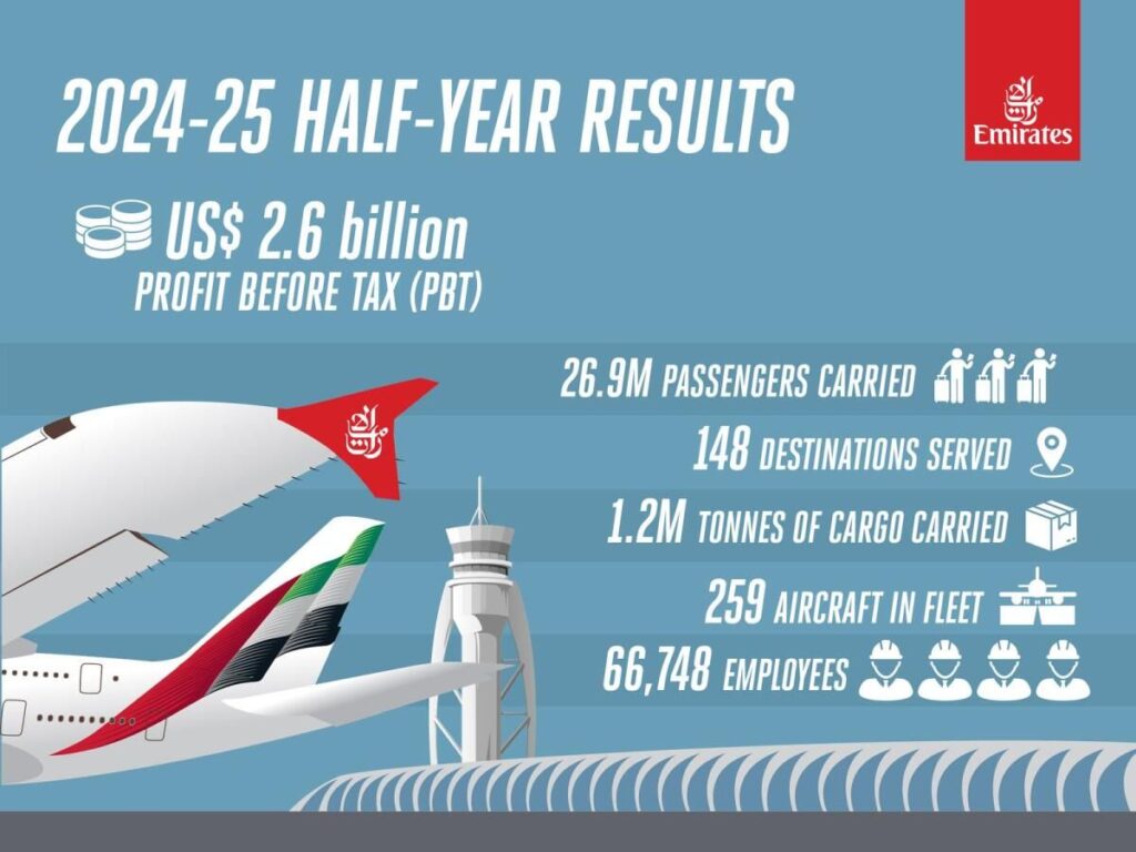 “2024-25’in geri kalanında müşteri talebinin güçlü kalmasını bekliyoruz ve yeni uçaklar Emirates filosuna katıldıkça ve dnata’da yeni tesisler devreye girdiğinde gelir artırma kapasitemizi artırmayı dört gözle bekliyoruz. Görünüm olumlu, ancak defne üzerinde durmaya niyetimiz yok. Kapasitemizi ve kaynaklarımızı dinamik bir pazarda konuşlandırmada çevik kalacağız ”dedi.Bağlantıyı artırmaHavayolu, 2024-25’in ilk yarısında Amsterdam, Cebu, Clark, Luanda, Lyon, Madrid, Manila ve Singapur olmak üzere sekiz şehre tarifeli uçuşları artırdıkça Emirates, Dubai merkezi aracılığıyla ağını geliştirmeye ve bağlantı seçeneklerini artırmaya devam etti.Havayolu ayrıca yedi kod paylaşımı, hatlar arası ve intermodal ortakla (AirPeace, Avianca, Blade, ITA Airways, Iceland Air, SNCF Demiryolu ve Viva Aerobus) yeni anlaşmalar yaparak müşteriler için bağlantı seçeneklerini güçlendirdi.Filosunda 259 uçağı bulunan havayolu, yolcu ve kargo ağını 30 Eylül’e kadar 80 ülkede 148 havalimanına genişletti. 2024-25’in ilk yarısında 26,9 milyon yolcu ve 1,2 milyon ton kargo taşıdı.Genişleyen ağHavayolu, 4 milyar dolarlık güçlendirme programı kapsamında, 1 Nisan ve 30 Eylül tarihleri arasında tamamen yenilenmiş iç mekanlara sahip 3 A380, 5 Boeing 777 olmak üzere sekiz uçak çıkardı.