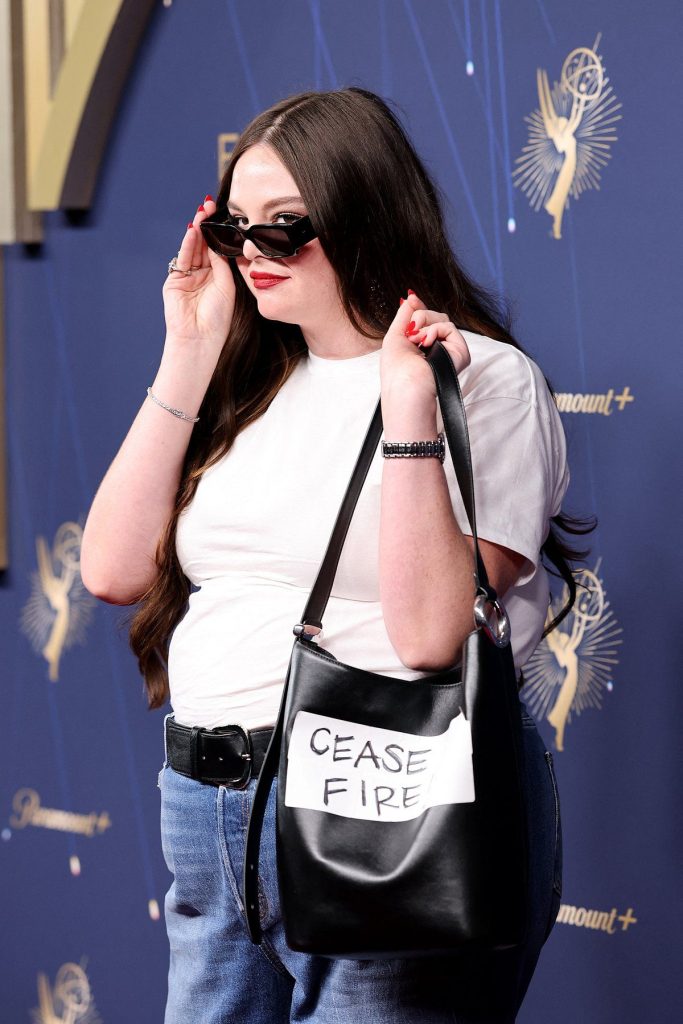 Bir Komedide En iyi Yardımcı Kadın Oyuncu ödülünü Hacks filmindeki rolüyle kazanan Hannah Einbinder, kırmızı ARTİSTS4 Ateşkes iğnesi takarak tonu belirledi. Beyaz Lotus yıldızları Aimee Lou Wood ve Natasha Rothwell, Ruth Negga ( Masum Olduğu Varsayılan ) ve Chris Perfetti ( Abbott İlköğretim Okulu ) dahil olmak üzere diğer adaylar ve aktörler ona katıldı.