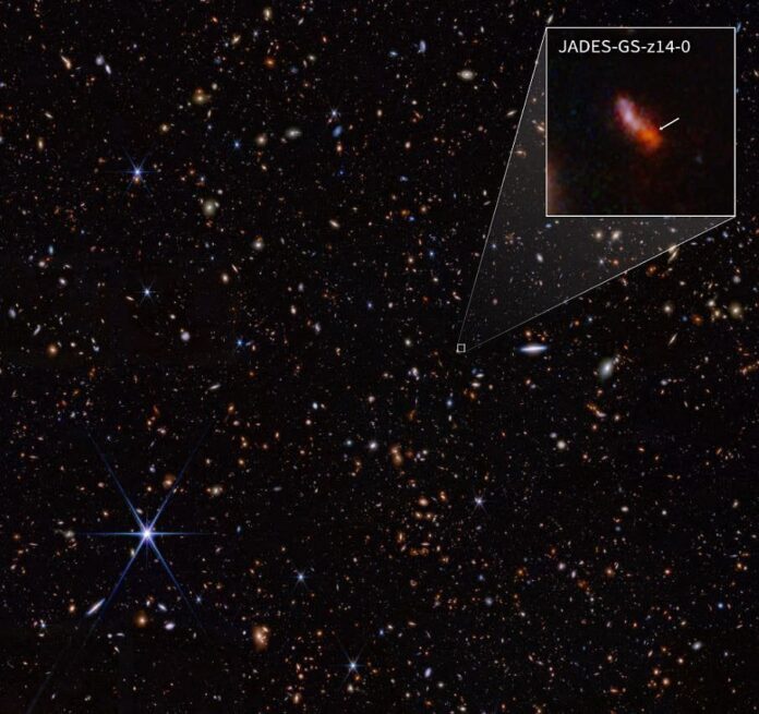 Geçen yıl James Webb Uzay Teleskobu tarafından keşfedilen JADES-GS-z14-0 gökadası o kadar uzakta ki ışığının Dünya’ya ulaşması 13,4 milyar yıl sürdü.