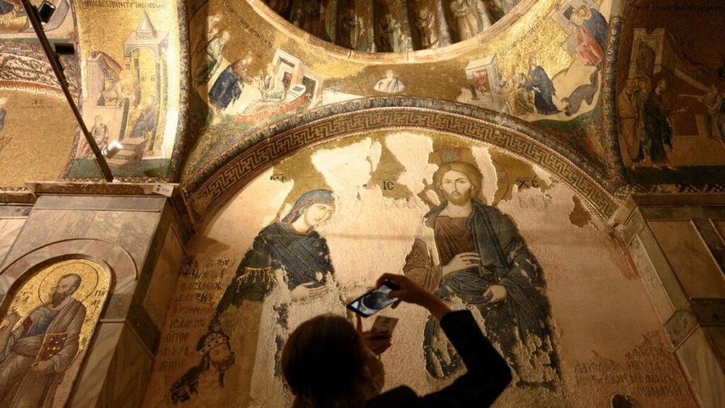 Türkiye Cumhurbaşkanı Recep Tayyip Erdoğan Pazartesi günü, Yunan protestoları karşısında İstanbul’da eski bir Bizans Ortodoks Kilisesi’nden dönüştürülmüş bir caminin yeniden açıldığını doğruladı.Erdoğan, Ankara’da Yunanistan Başbakanı Kyriakos Mitsotakis ile yaptığı görüşmede, ülkelerin ilişkilerini güçlendirmeyi amaçlayan bir gezide kiliseyi görüştü.Rum liderle birlikte düzenlediği basın toplantısında Erdoğan, “Kariye Camii yeni haliyle herkese açık kalacak.” dedi.“Kariye camimizi özenli restorasyon çalışmalarının ardından ibadete ve ziyaretlere açtık.”Mitsotakis, Kutsal Kurtarıcı’nın 14. yüzyıldan kalma fresklerle süslenmiş Kore’ye dönüştürülmesine itiraz etmişti. Son Yargı hala Hıristiyanlar tarafından değer verilen.Erdoğan’a son hamleden şikayetçi oldu.“Dönüşüm konusunu Sayın Erdoğan ile görüştüm… Yunan başbakanı Türk liderle görüştükten sonra kendisine memnuniyetsizliğimi ifade ettim”dedi.“UNESCO dünya mirası listesinde yer alan bu anıtın eşsiz kültürel değerini tüm ziyaretçilerin erişimine açık kalabilmesi için korumak çok önemli.”