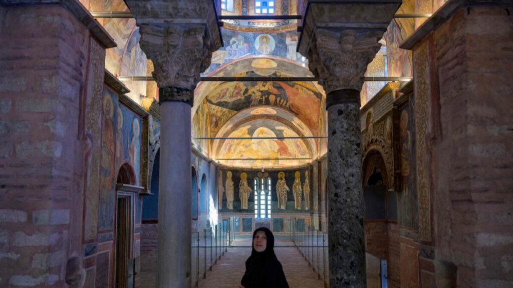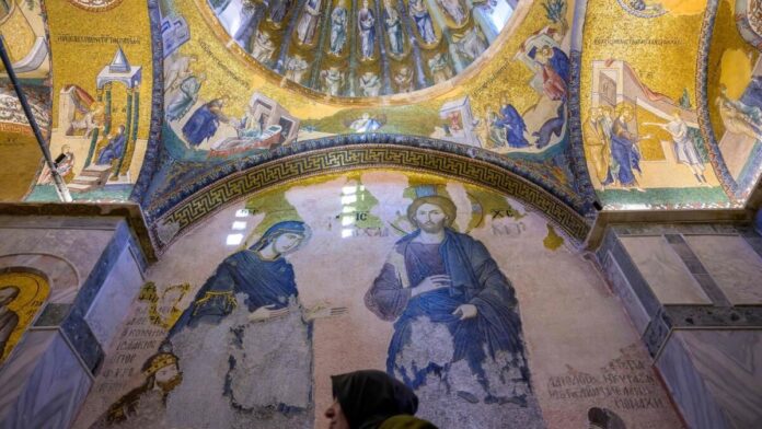 İstanbul’da Kariye Camii olarak dönüştürülen eski Ortodoks Kilisesi’nin içinde bir ziyaretçi duruyor. — Fotoğraf: AFPKilise, 1453’te Konstantinopolis’in Osmanlı Türkleri tarafından fethinden yarım yüzyıl sonra Kariye Camii’ne dönüştürüldü.II. Dünya Savaşı’ndan sonra, Türkiye’nin Osmanlı İmparatorluğu’nun küllerinden daha laik bir cumhuriyet kurmaya çalıştığı Kariye Müzesi oldu.Erdoğan, 2020 yılında binanın Müslüman bir ibadet yerine dönüştürülmesini emretti.Emri, İstanbul’daki UNESCO tarafından korunan Ayasofya katedrali hakkında da benzer şekilde tartışmalı bir kararın ardından geldi.Kariye Camii’nin 6 Mayıs’ta yeniden açılması sırasında Yunanistan dışişleri bakanlığı bu hareketi “provokasyon” olarak nitelendirdi.Erdoğan Pazartesi günü yaptığı açıklamada, “UNESCO kültür mirasının bir parçasını oluşturan herhangi bir anıtı korumaya ve onu milletimizin ve tüm insanlığın yararına erişilebilir kılmaya” büyük önem verdiğini” söyledi.”