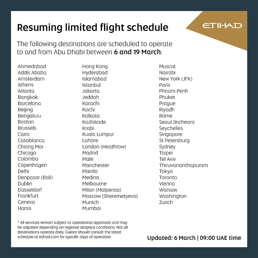 Havayolu Cuma günü yaptığı açıklamada, Etihad Airways’in 6 Mart 2026’dan itibaren Abu Dabi ile bir dizi kilit varış noktası arasında faaliyet gösteren sınırlı bir ticari uçuş programına devam edeceğini duyurdu.