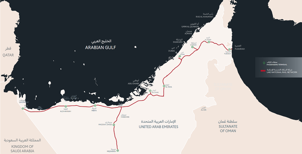 Yolcu demiryolu ağı, Suudi sınırına yakın Al Sila’dan Sharjah’taki Al Dhaid’e ve Abu Dabi’nin batı bölgesinden doğu kıyısındaki Fujairah’a kadar uzanan BAE genelinde 11 istasyonu birbirine bağlayacak. Bu istasyonlar birlikte çöl kasabalarından, kıyı topluluklarından, kültür merkezlerinden ve gelişmekte olan destinasyonlardan geçen bir rota oluşturur.