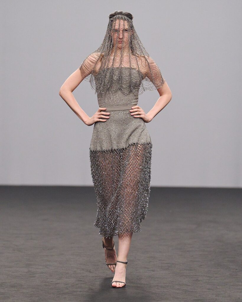 Takıntı gerginlik ve yapı getirdi: korse, dramatik pantolonlar ve abartılı omuzları daha karamsar tonlarda sabitlenmiş ceketler. Kresha bunu zırh giymiş duygu olarak tanımlar.