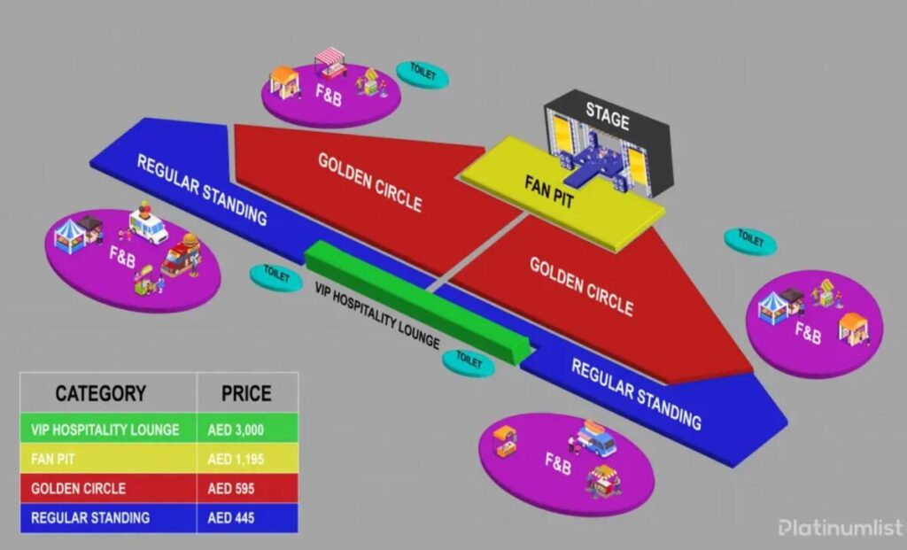 LocationVIP ağırlama salonu Dh3.000, Ön çukur Dh1.195, Altın çember Dh595, Normal ayakta Dh445