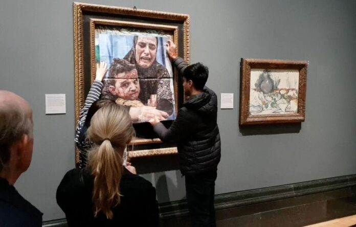 Çarşamba günü aktivistler, Londra’daki bir galerideki Picasso resminin üzerine Gazze’de kanlı bir anne ve çocuğun fotoğrafını kısaca yapıştırarak İsrail’e silah ambargosu çağrısında bulundular.