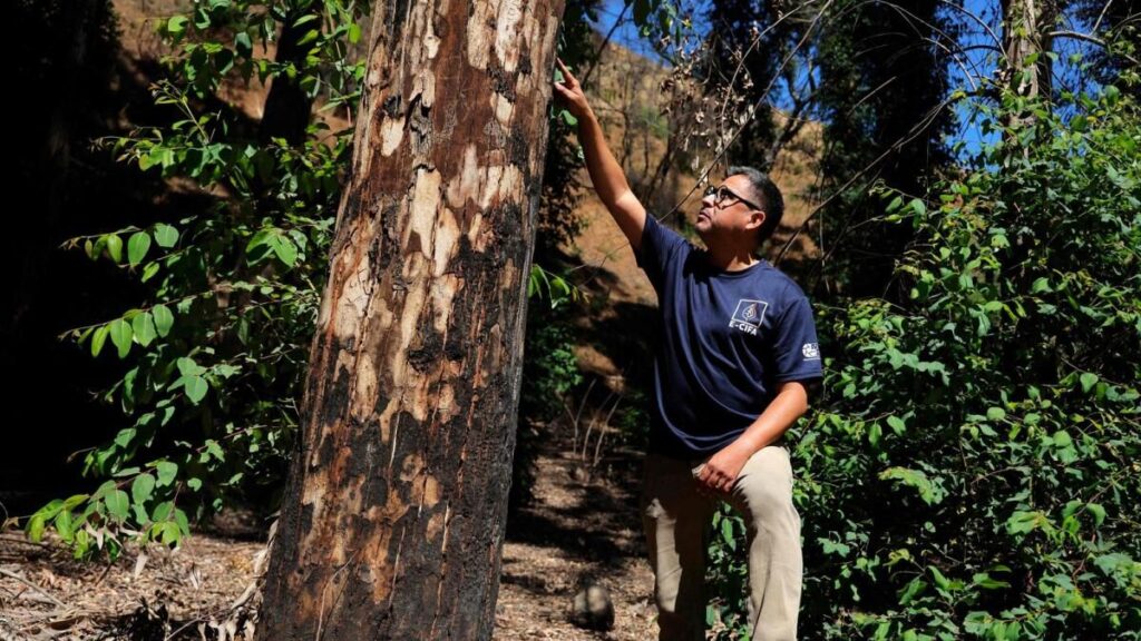 Orman türlerinin çeşitli fiziksel ve kimyasal yönlerini ve bunların yangın öncüsü olarak potansiyellerini incelemeye odaklanan Universidad Tecnico Federico Santa Maria Makine Mühendisliği Bölümünde araştırmacı olan Fabian Guerrero, Şili’nin Vina del Mar kentindeki Botanik Bahçesi’ndeki orman yangınlarından etkilenen bölgedeki bir ağacın izlerini gösteriyor. 18 Aralık 2024USM araştırmacısı Fabian Guerrero, bilimsel deneylerin, örneğin tüy ve litrenin okaliptüs ve çamdan daha az yanıcı olduğunu gösterdiğini söyledi.Cehennem geçen Şubat ayında patlak verdiğinde, itfaiyecilerin parkın çoğunu bir saatten daha kısa sürede tüketmesini durdurmak için yapabilecekleri çok az şey vardı.Ancak doğa yavaş yavaş iyileşiyor: Şili’nin merkezinde 2024’te bol yağış — on yıldan fazla kuraklıktan sonra — botanik bahçesine şimdiden yeşil sürgünler getirdi.Peirano, yaz kuraklığına dayanıklı sklerofil ormanlarının güzelliğinin “yanan ağaçların geri gelmesidir” dedi.