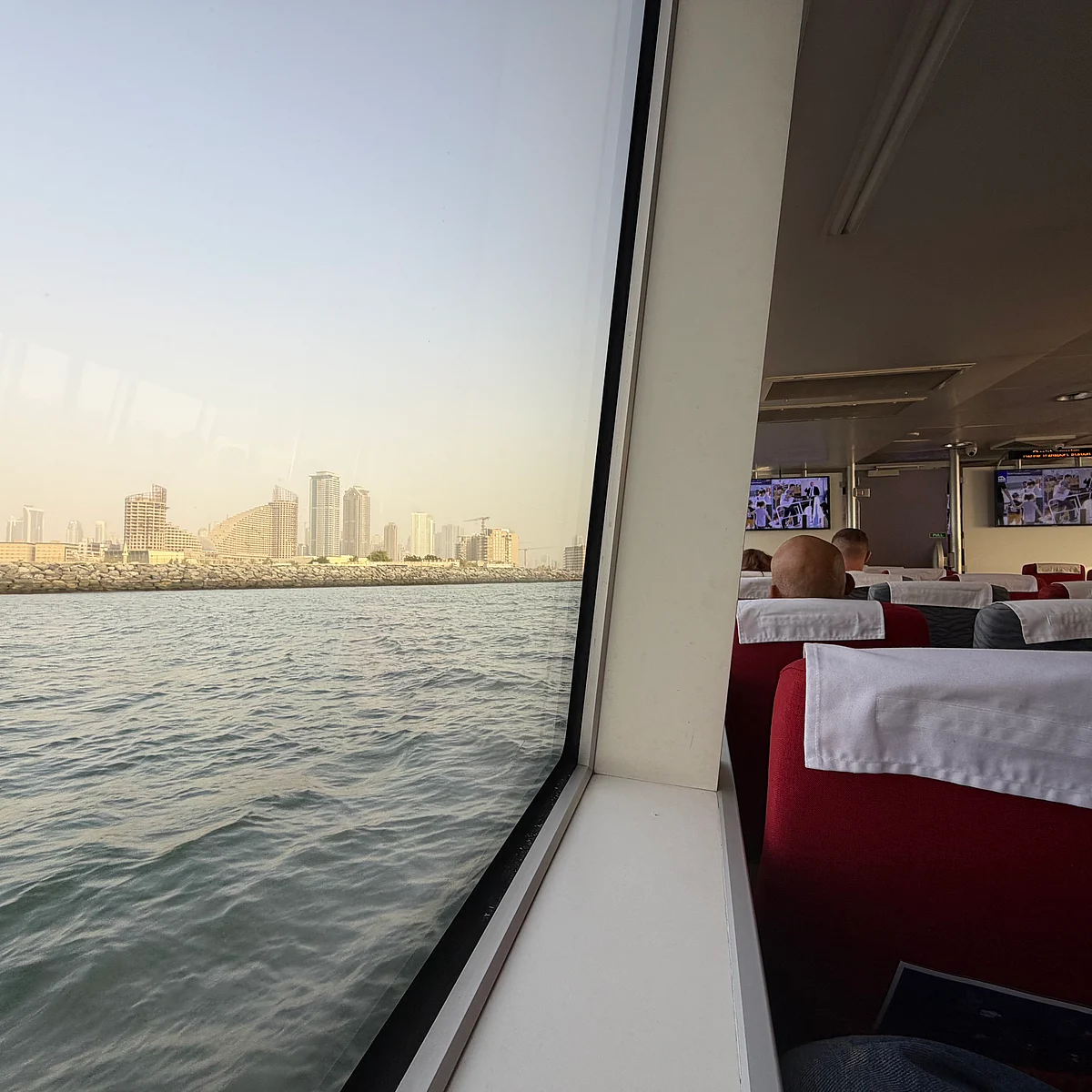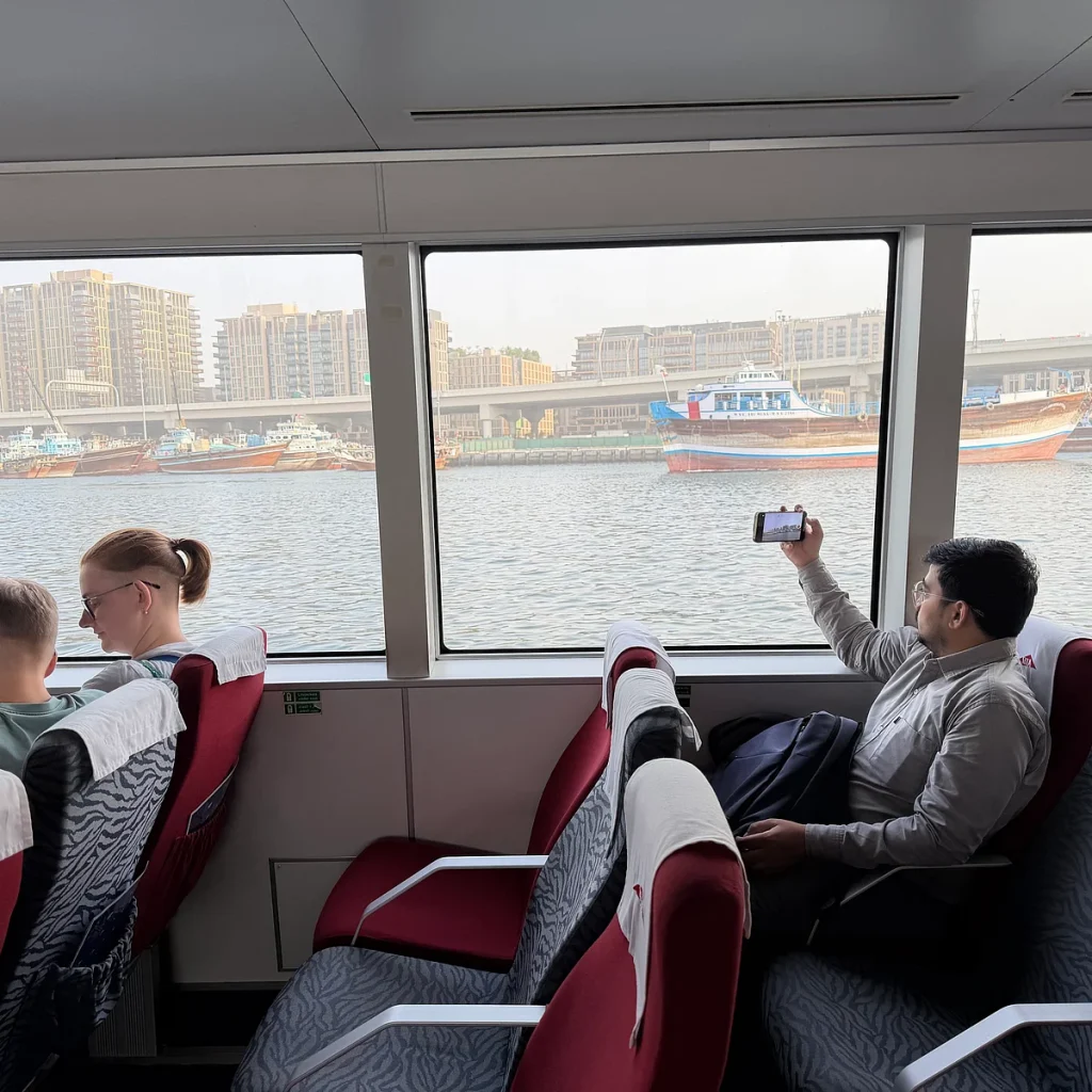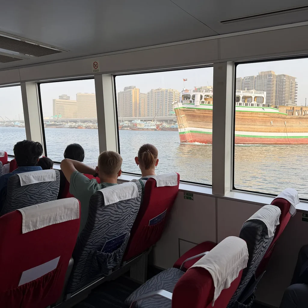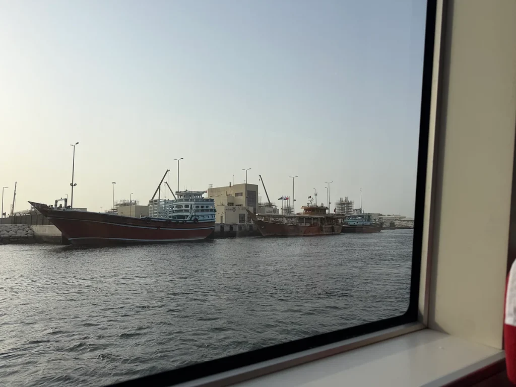 Feribot tam zamanında kalktı. Dubai’nin silüeti öğleden sonra ışığında parlarken, beyaz ve gri deniz kuşları yukarıda süzüldü ve dalgaların sesi her zamanki korna ve yoğun saat stresini boğdu. Koltuğumdan Dubai’nin iki tarafının aynı anda açıldığını görebiliyordum, bir tarafta modern sahil evleri ve depolar; Diğer tarafta, beyaz, mavi ve kahverengiye boyanmış, rıhtımlara hafifçe sallanan renkli geleneksel gemilerden oluşan bir çizgi.