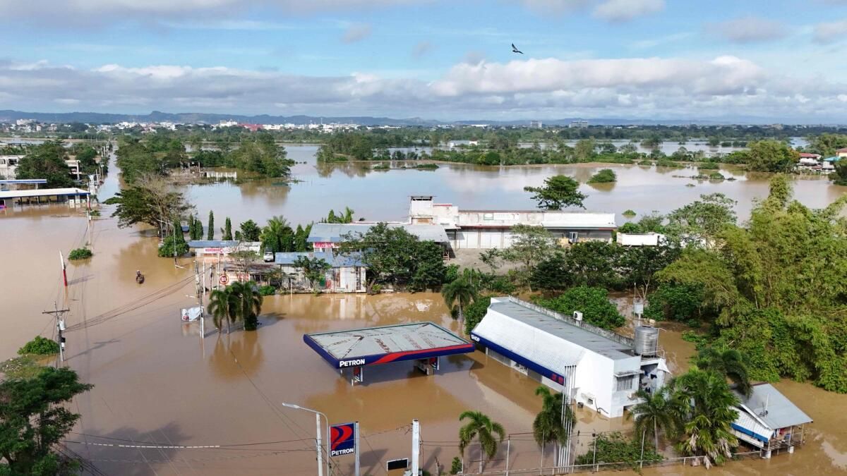 Binalar, lamba direkleri ve ağaçlar, eyalet afet yetkilisi Ian Valdepenas’ın sel sularının bazı yerlerde dört metreden (14 fit) fazla ulaştığını söylediği Cagayan eyaletindeki Tuguegarao şehrindeki kahverengi su gölünden geçti.
