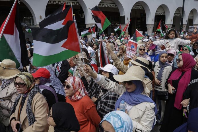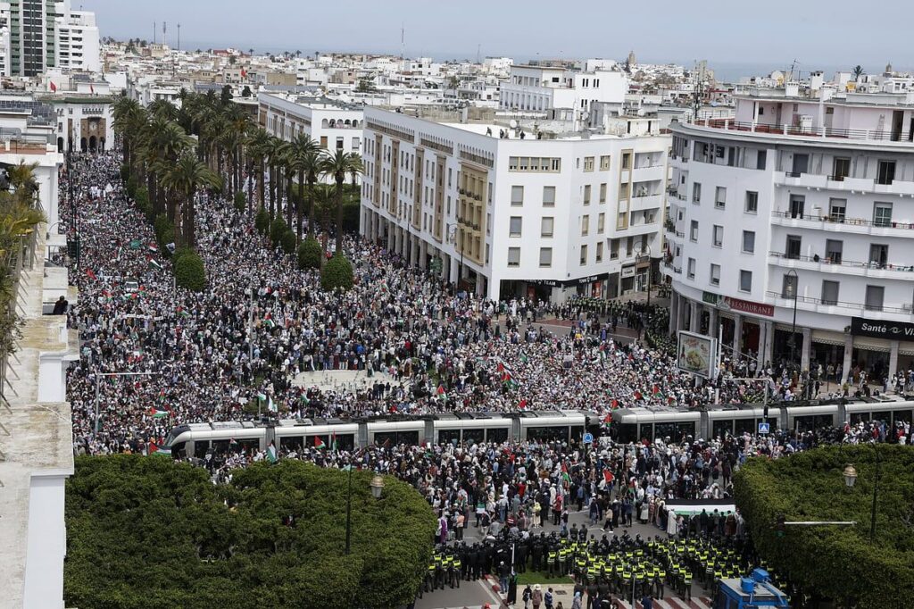 Başkent Rabat’ta birkaç aydır devam eden en büyük Filistin yanlısı protesto, islamcıların egemen olduğu koalisyon Adalet ve Kalkınma partisi tarafından çağrıldı.