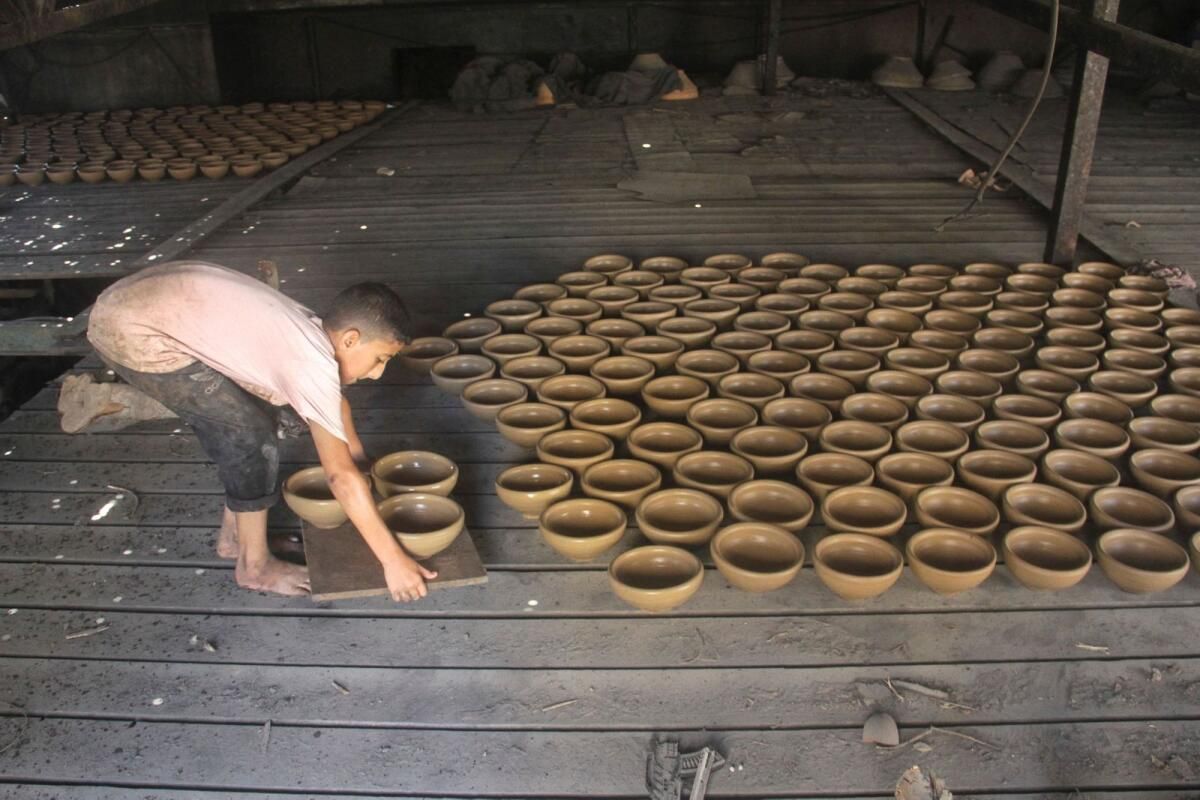 Bir Filistinli, 13 Ağustos 2024’te Gazze şehrinde bir çömlek atölyesinde çalışıyor. – Reutersİsrail’in kısıtlamaları ve yardım ulaştırmanın tehlikeleri nedeniyle ithalatın giderek zorlaşmasıyla Gazzeliler, savaşın başlamasından bu yana ihtiyaçlarını karşılamak için becerikli yollar bulmak zorunda kaldılar.Talebe ayak uydurmak için durmadan çalışan Atallah, Gazze’nin kuzeyindeki fabrikasının savaştan önce yaptığı 1.500 birimin tam aksine, başta kaseler ve bardaklar olmak üzere günde yaklaşık 100 parça üretiyor.Gazze’de kapatılan, çoğu hava saldırıları sırasında tahrip olan, çatışmalar nedeniyle erişilemeyen veya malzeme ve elektrik kıtlığı nedeniyle çalışamayan çok sayıda fabrikadan biridir.Bugün Atallah, ince mavi plastik bir tabakanın altına kurulmuş çıplak kemikli bir atölyede çalışıyor.Kili özenle çok ihtiyaç duyulan tabaklara dönüştürüyor, sonra pişmiş toprak kreasyonlarını güneşte kurumaya bırakıyor – Gazze’de hala bol miktarda bulunan birkaç şeyden biri.