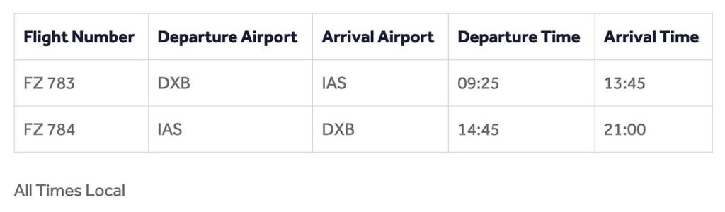 Yaş Uluslararası Havaalanı’na (IAS) uçuşlar, Dubai Uluslararası Terminal 2’den (DXB) Salı ve cuma günleri haftada iki kez gerçekleştirilecektir. Emirates, yolculara Dubai’nin uluslararası havacılık merkezi üzerinden bağlantılar için daha fazla seçenek sunarak bu rotada kod paylaşımı yapacak.İşletme Sınıfı ücretleri dxb’den ums’ye iade etmek 8.000 Dh’den başlar ve Ekonomi Sınıfı Lite ücretleri 1.600 Dh’den başlar.
