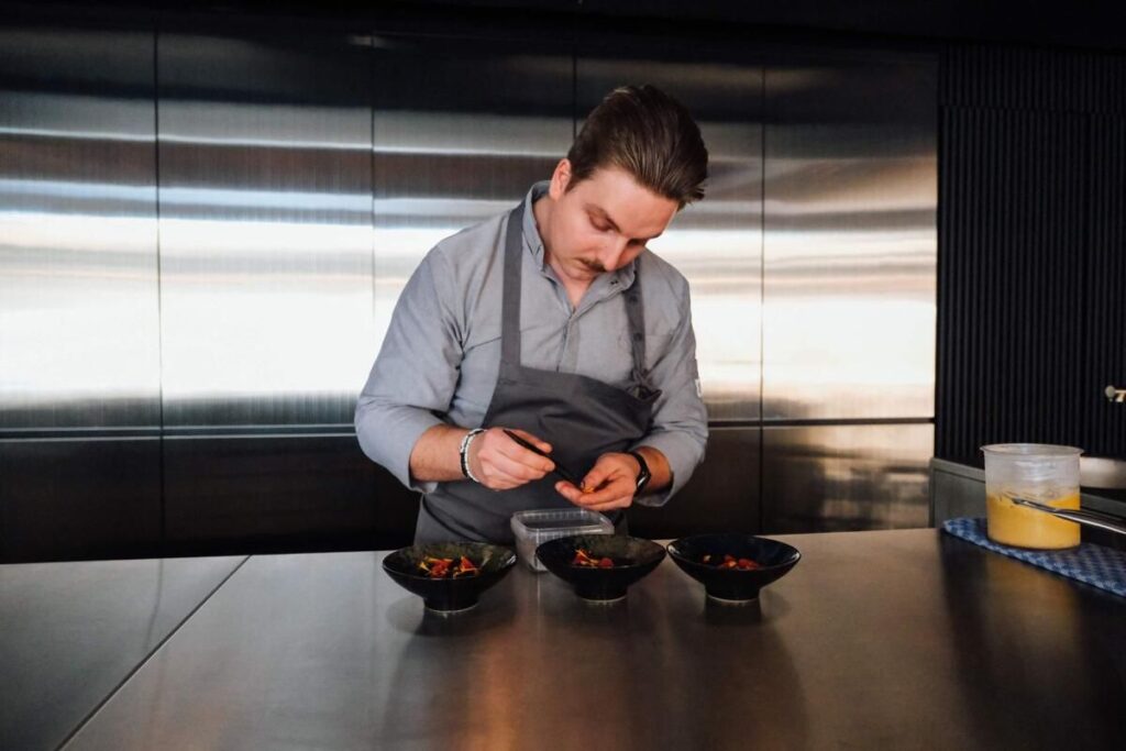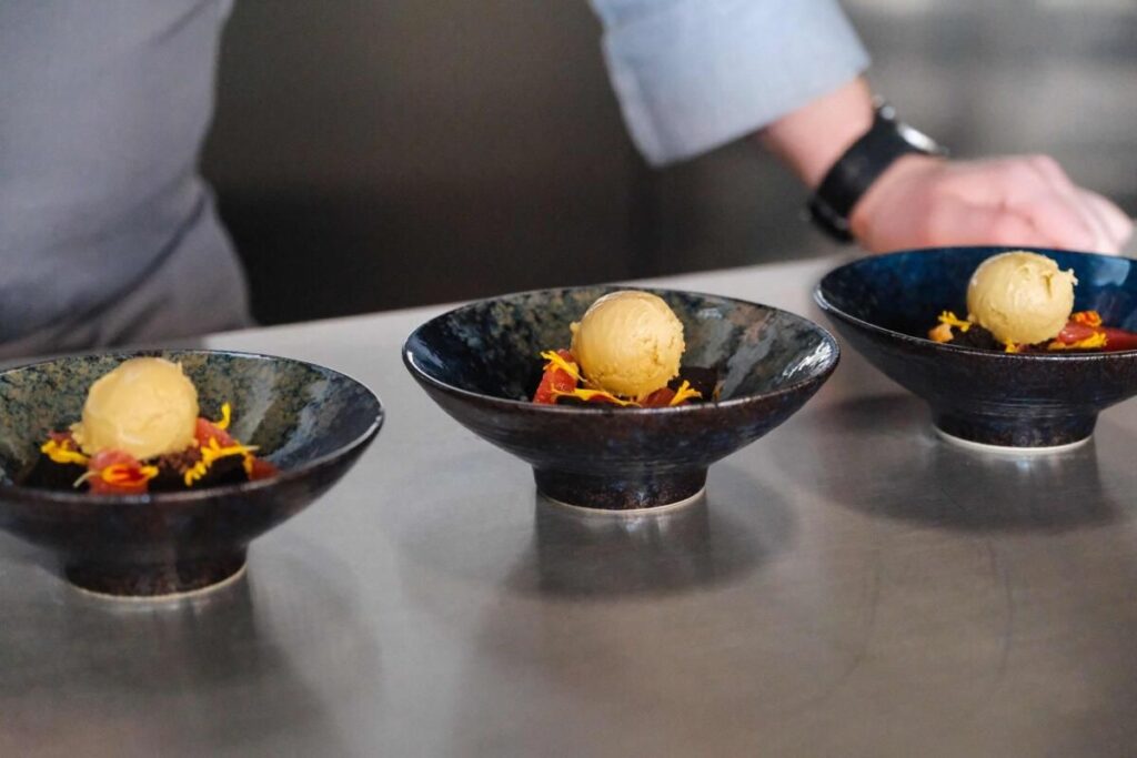 Şef Miikka Manninen, Finlandiya’nın Vantaa kentinde 2 Mayıs 2024 2024 tarihinde Solar Foods şirketinin merkezinde Solein proteini ile hazırlanan malzemelerle bir tatlı hazırlıyor. — AFP