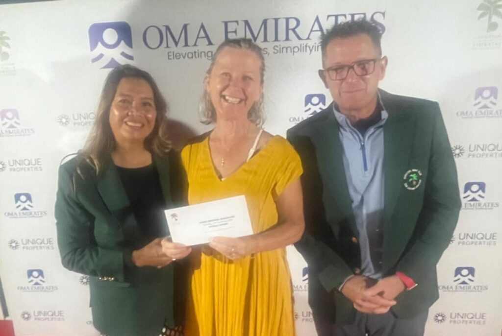 Leydi Kaptan Josie Tracey (l) ve Erkekler 'in Kaptan Yardımcısı Scott Campbell (r) ile Majlis Sahası üzerinde Emirates Golf Kulübünde düzenlenen Benzersiz Mülklerle birlikte son OMA Emirates Medalford’da Bayanlar' Stableford Bölümü, Sıog Moore (c) 'nin Galibi. – Verilen fotoğraf74 Kişilik güçlü bir alanın yer aldığı yarışmada Emirates Golf Kulübü, Dubai Creek Golf & Yacht Club, Saadiyat Beach Golf Kulübü, Dubai Hills Golf Kulübü ve Emirates Golf Federasyonu (EGF) gibi en iyi golf kulüplerinden üyeler yer aldı. Etkinlik, Geraghty’nin olağanüstü performansıyla sonuçlanan heyecan verici bir yetenek, dostluk ve sportmenlik gösterisiydi.O gün övgüye değer puanları olan diğerleri arasında Paul Byrne (8) A Bölümü kategorisini kazanmak için net 69 ile.Siog Moore, Bayanlar Stableford etkinliğinde etkileyici bir 40 Stableford puanı ile zafer kazandı.