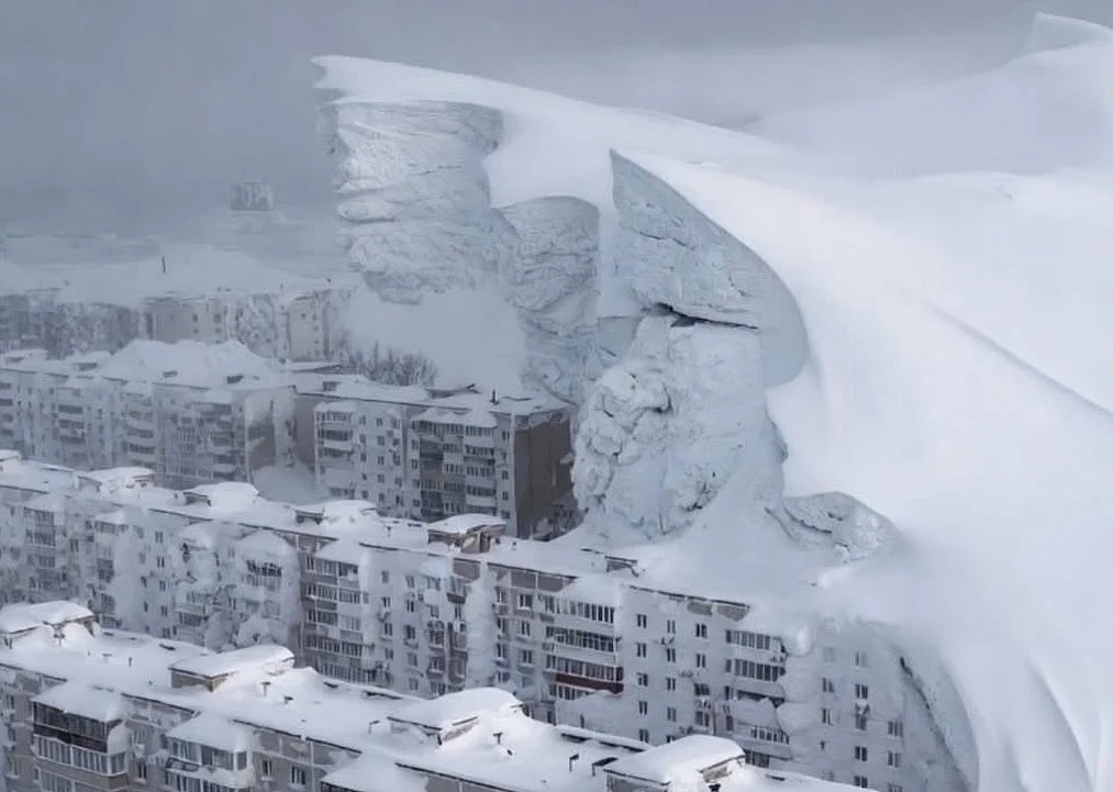 Görüntüler, sanki bir dalgaya yakalanmış gibi, apartmanların üzerinde yükselen karların başgösteren uğursuz yapılarını gösterdi.