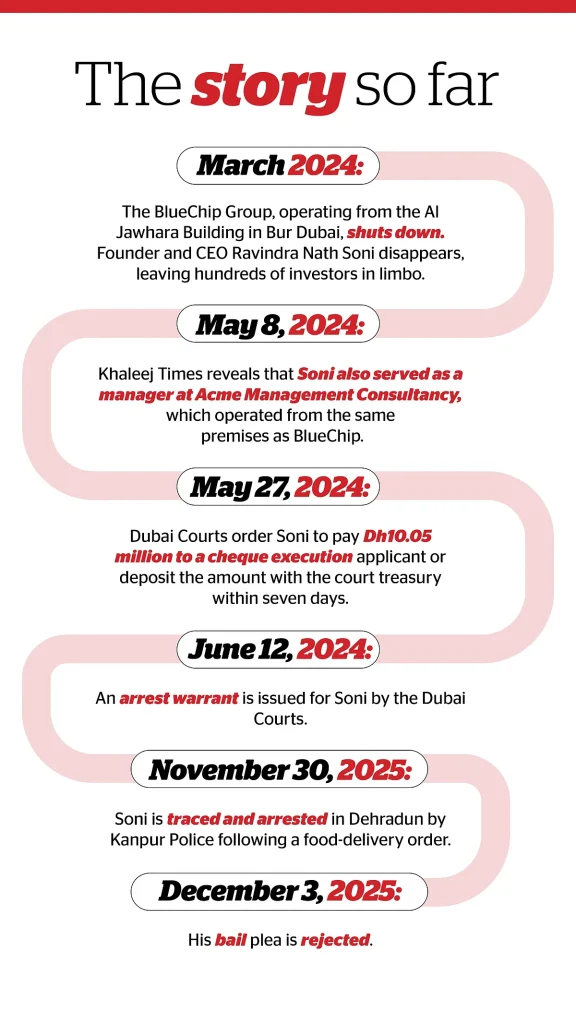 Soni’nin tutuklanması, Khaleej Times’ın Bluechip’in Haziran 2024’teki çöküşünü ilk kez ifşa etmesinden bir yıldan fazla bir süre sonra gerçekleşti.Yıllık yüzde 36 getiri sözü veren şirket, Mart 2024’te aniden kapanarak yüzlerce BAE sakinini 100 milyon dolardan fazla zararla karşı karşıya bıraktı.