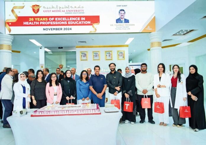 Körfez Tıp Üniversitesi (GMU) Ajman, 26. yılını Thumbay Grubu’nun kurucu başkanı Dr. Thumbay Moideen’in katıldığı özel bir törenle kutladı; Thumbay Grubu sağlık bölümü başkan yardımcısı Ekber Moideen Thumbay ve üniversite kolejlerinin dekanlarının yanı sıra diğer personel ve öğrenciler.
