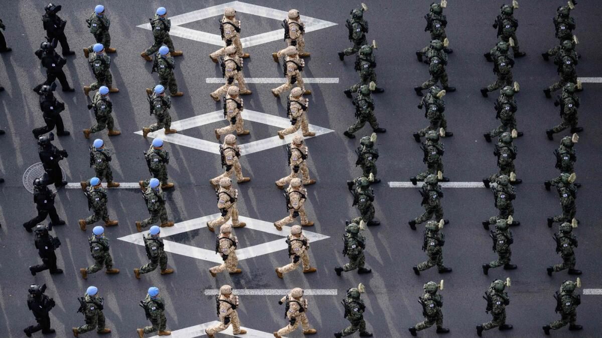 Güney Kore, sekiz tonluk bir savaş başlığı taşıyabilen balistik bir füze sergiledi ve Salı günü Seul’deki askeri geçit töreninde ABD’li bir bombardıman uçağının uçuşunu sergiledi ve şu anda Kuzey Kore tehditlerine yanıt vermeye hazır olduğunu belirtmek için her yıl düzenlenen bir güç gösterisi.