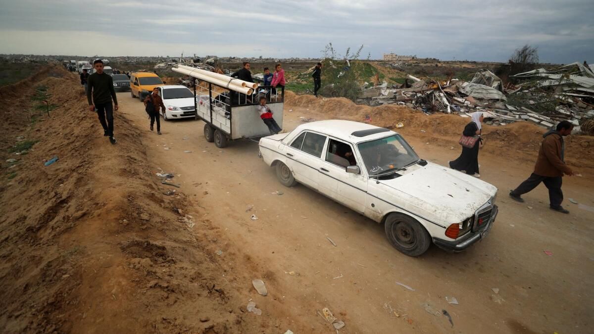 Hamas’ın İsrail ordusunun geri çekildiğini duyurması üzerine Pazar günü koridordan geçen insan kalabalığı görülürken, uzun bir sıra araba toplanarak geçmeyi bekliyordu.