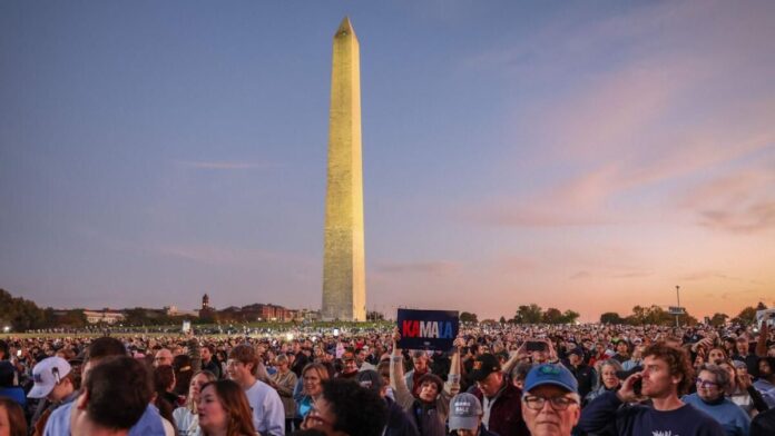 Kalabalıklar, Harris’in konuştuğu Beyaz Saray arazisini çevreleyen bir park olan Elips’ten, Ulusal Alışveriş Merkezi’nin üzerinde yükselen dikilitaş olan Washington Anıtı’na kadar uzanıyordu.