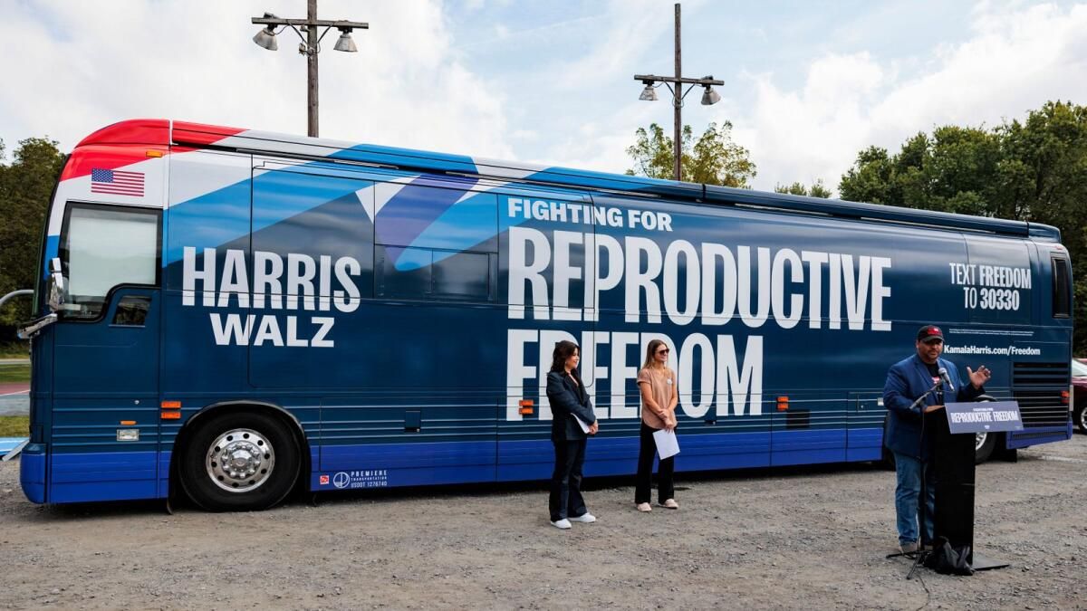 Kürtaj hakları savunucusu ve Kamala Harris’in başkanlık kampanyasının destekçisi Hadley Duvall, 12 yaşında üvey babası tarafından nasıl tecavüze uğradığını ve hamile bırakıldığını anlatırken, samimi bir kalabalık mavi bir otobüsün etrafında toplandı ve dikkatle dinledi.