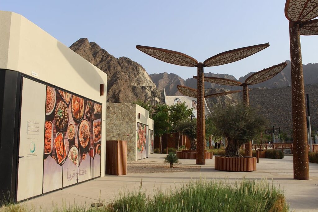 Binalar, yakında restoranlar ve perakende mağazaları olacak olan bölgenin çevresini çevreliyor. Bölge şu anda halka açık, ancak öndeki tabelalara göre dükkanlar yakında açılacak. Bu alanlar, Hatta sakinlerine ayrılan 14 yeni yatırım fırsatının bir parçası olup, onlara yerel kültürü yansıtan ve turizmi destekleyen kafeler, restoranlar, büfeler ve küçük işletmeler işletmeye öncelik veriyor.