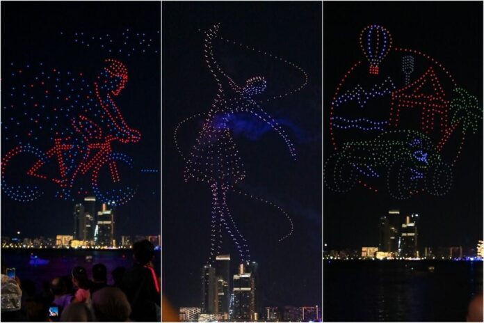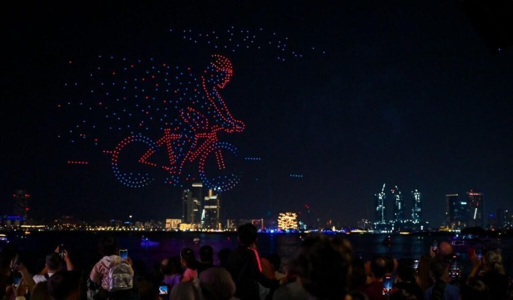 Dubai Alışveriş Festivali’nin (DSF) 30. baskısı olan 13 Aralık Cuma günü Bluewaters Adası’nın üzerindeki gece gökyüzünü aydınlatan 1.000 drondan oluşan muhteşem bir gösteri. Saat 8’de başlayan 15 dakikalık performansta, dronlar, havai fişekler ve ‘dans eden’ paraşütçülerin ayaklarından akan fişeklerle çarpıcı bir birleşimi yer aldı ve seyirciler için unutulmaz bir deneyim yarattı.Gösteri için geri sayım saat 7: 59’da başladığında, sahil boyunca toplanan kalabalık, anı yakalamak için hevesle telefonlarını çekti. Çocuklar daha iyi bir manzara elde etmek için ebeveynlerinin omuzlarına tünerken, gökyüzü hayranlık uyandıran görüntülerle aydınlandı. Dronlar, ikonik DSF logosu, bir roller coaster, hareket halindeki bir balerin ve bir bisikletçi de dahil olmak üzere çeşitli çarpıcı görseller oluşturdu ve her biri kalabalıktan şaşkınlık çekti.Dubai Festivalleri ve Perakende Kuruluşu’nda (DFRE) Etkinlik Planlama müdür yardımcısı Kaltham Al Shamsi, neredeyse bir yıllık planlamanın gösteriye girdiğini açıkladı. “Kolay görünebilir ama bunu Aralık 2023’te planlamaya başladık” dedi. “Bütün bir moodboard’u yarattığımız zamanlar vardı, ancak düşündüğümüz şekilde tam olarak işe yaramadı, bu yüzden geri dönüp onu yeniden yaratmamız gerekiyordu. Bu yüzden çok karmaşık, uzun bir prosedür.”